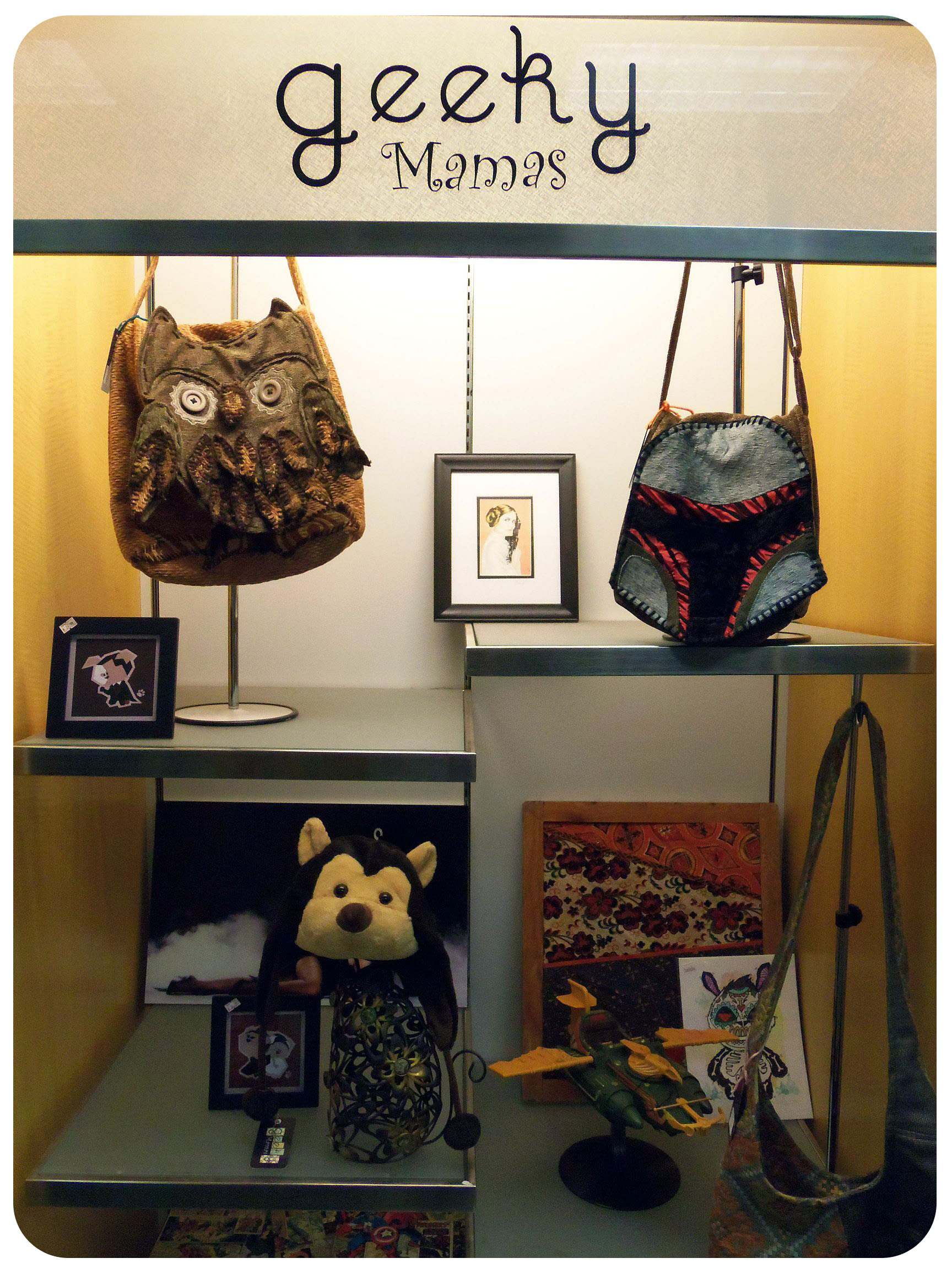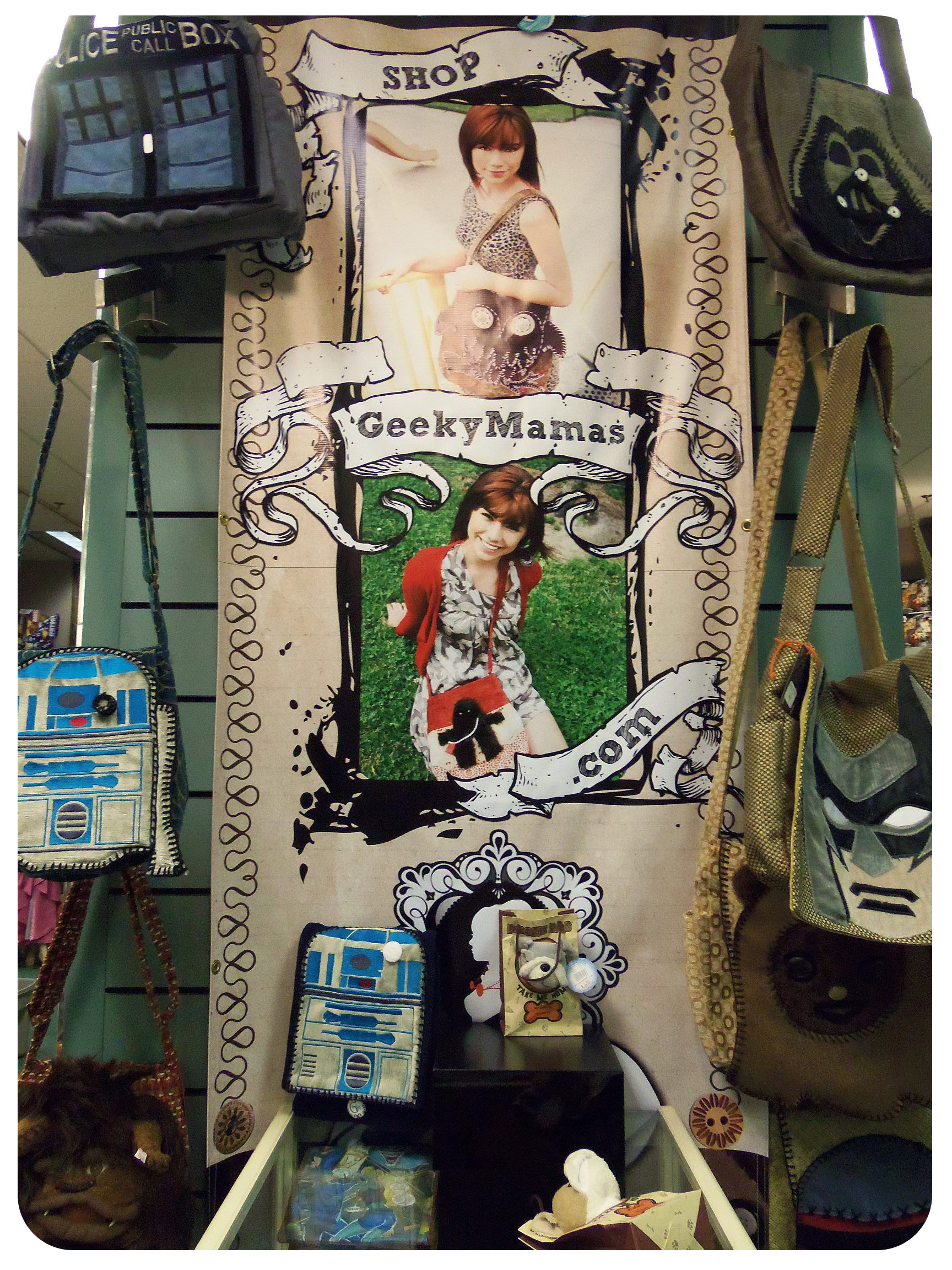 I discovered Geeky Mamas last year when a friend on Facebook tagged one of their items for me to look at, an Ewok-inspired apron. It was incredibly unique and cute in its styling, and I was immediately interested in whatever company it was that was making such wonderful items! On their site I found the bag of my dreams – a Boba-Fett themed bag in beautifully rich colors. It was clear that this company was special and quite unlike anything I’d seen before. I loved it. What I loved even more was that they had a physical location in Southern California! I immediately took off for the store to immerse myself in their wonderfully chic, artsy and original creations.