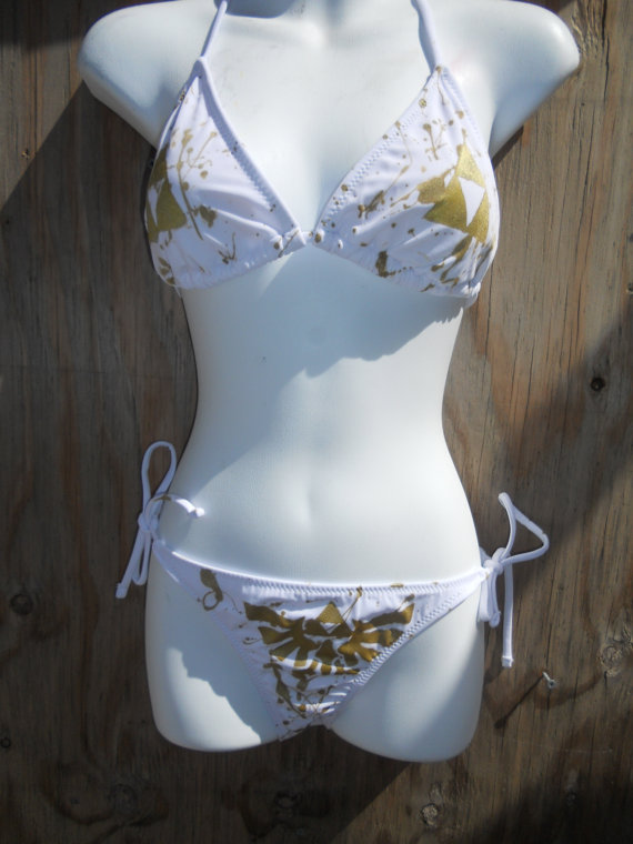 I found these hand painted swimsuits by Stitch3d on etsy. The shop carries both Zelda and Hunger Games bikinis, and has a great assortment of regular clothes too.