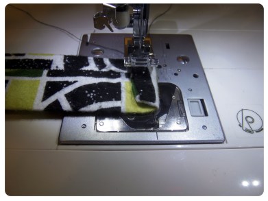There’s a variety of ways you can close the ends of your fabric tube around the ends of the belt boning. If you want to have very clean ends I would suggest machine and/or hand sewing the ends closed. Because I knew the elastic I was going to attach would cover the ends of the headband, I simply folded over the open ends of the fabric and ran a quick stitch over it.