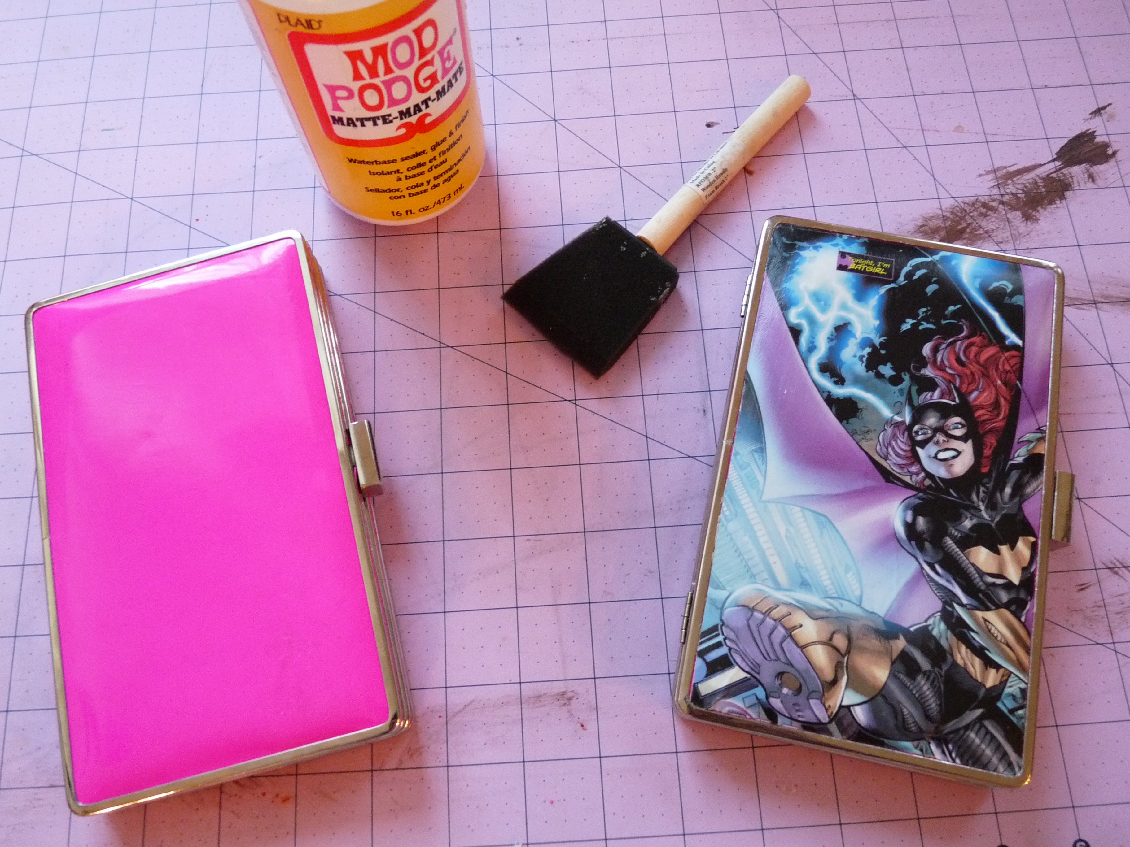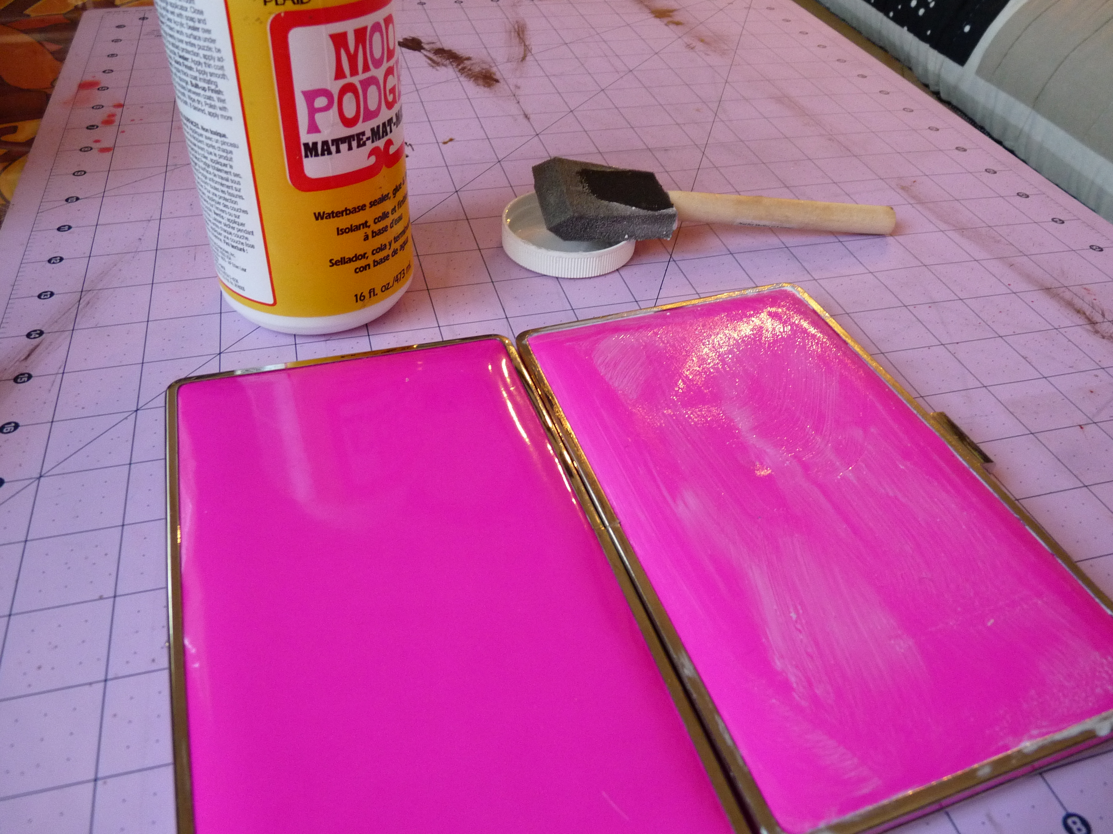 The basic steps are of course: Apply Mod Podge to one side of the wallet. Paste the image, seal with multiple coats of Mod Podge, repeat process on other side of the wallet. Done. But there’s obviously a little more to it then that, so below is the detailed process: