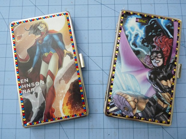 I love this idea. I actually need a new wallet, so I’ll try and find a non-fabric one that would allow me to glue stuff onto it. And since you asked, I think they look better without the rhinestones – the glitter distracts the eye from the images.