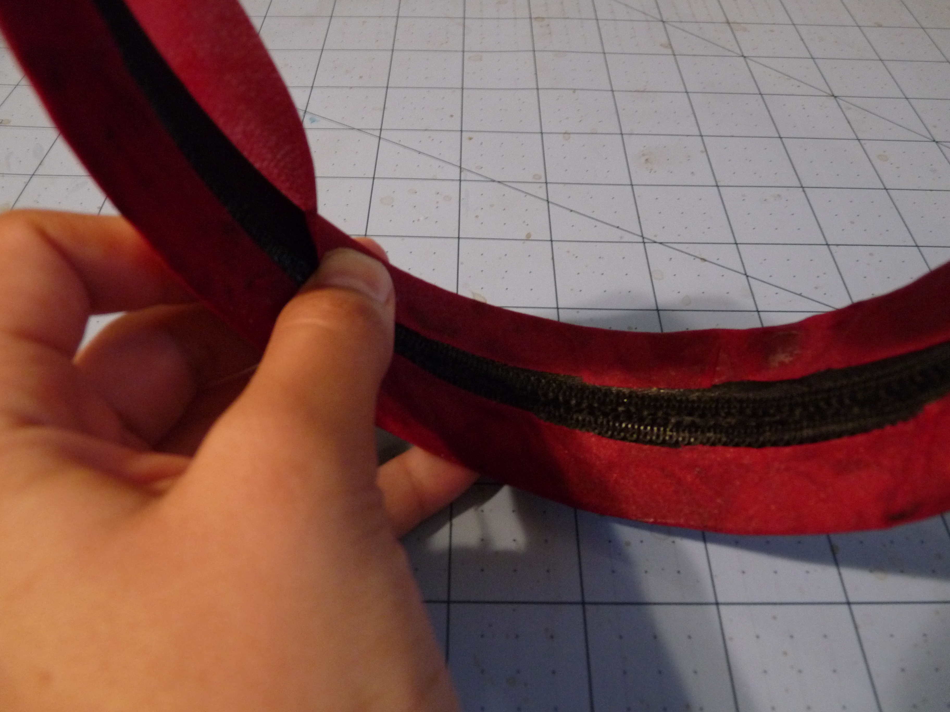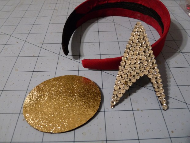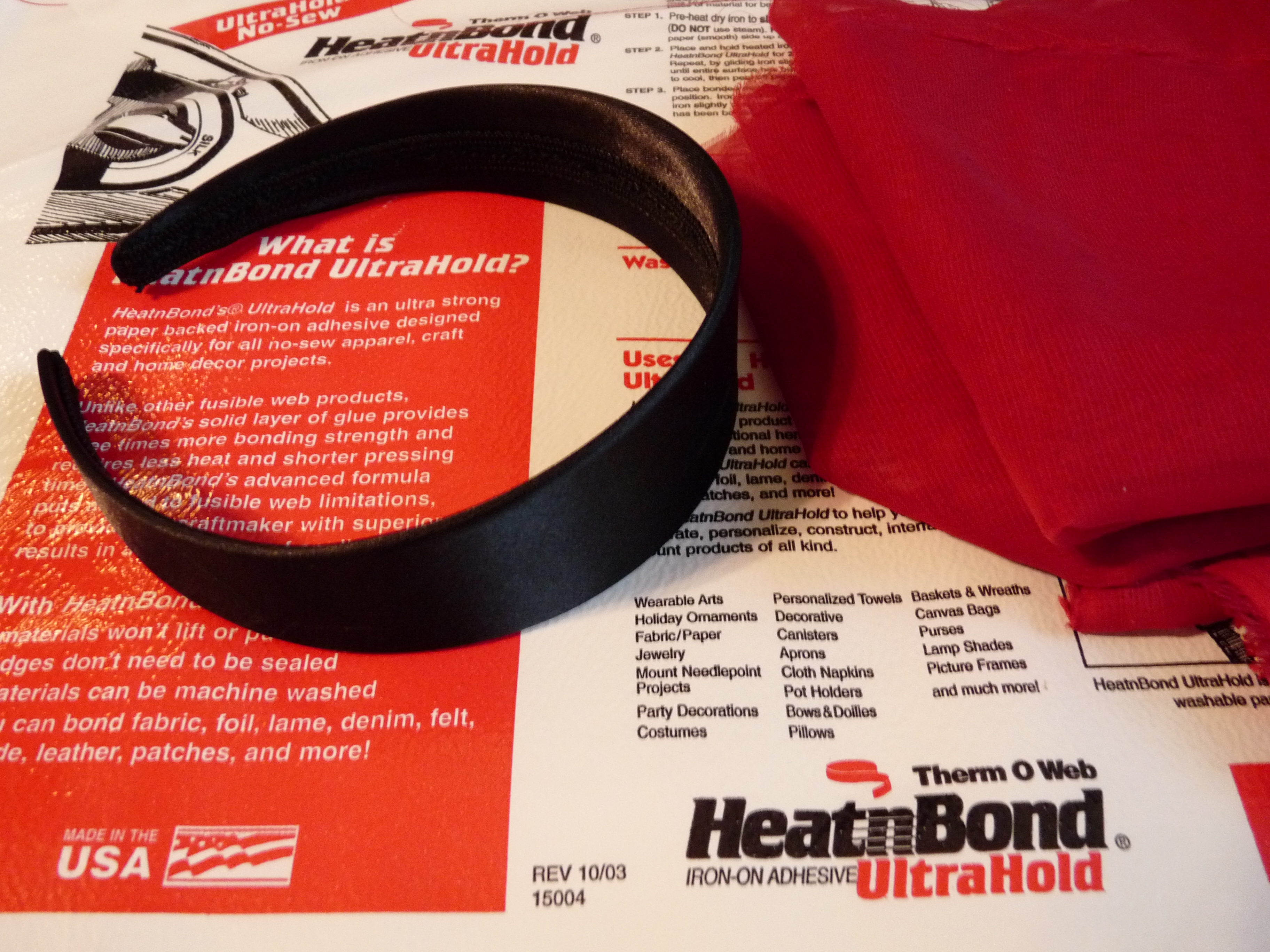 I ironed on a strip of Heat-N-Bond to the fabric I was going to use, peeled the backing off the other side of the Heat-N-Bond, and then ironed on the fabric to the headband. Obviously you need to be using a fabric-covered headband as opposed to a plastic one in order to have something for the Heat-N-Bond to adhere to. Once the fabric is adhered to the top part of the headband, it’s a simple process of folding over the sides of the fabric and using the tip of the iron to adhere the excess fabric to the inside of the headband. This Star Trek headband is specifically Next Generation, so I only covered 3/4 of the headband so that I could make it resemble the cut of the Starfleet uniform.