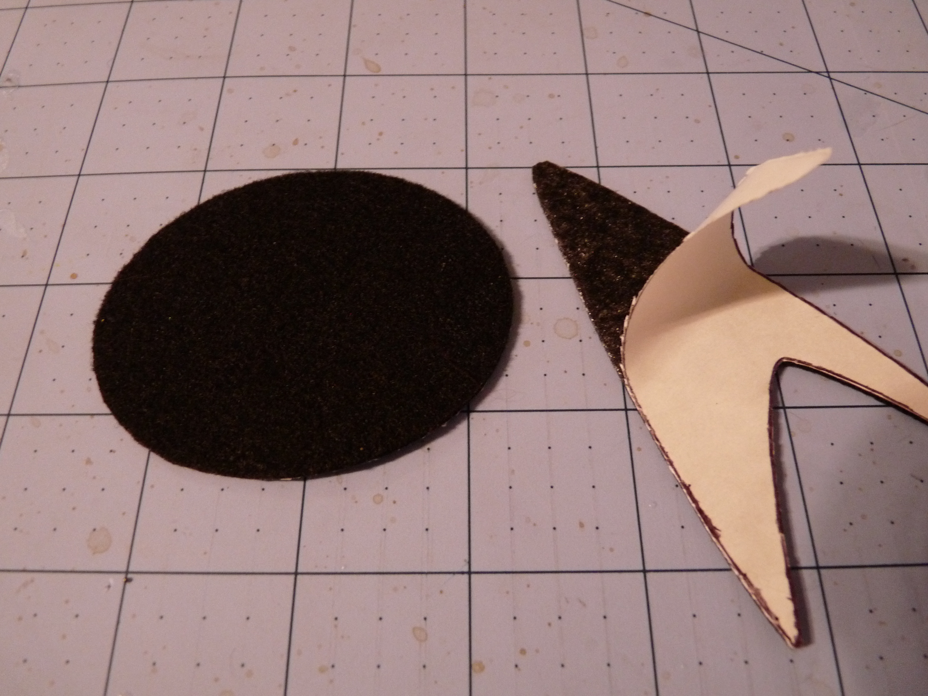 I cut the delta insignia out of sticky back felt. Sticky back felt is useful as it gives me a clean felt finish on one side, but I don’t have to worry about making a mess with the felt on the other side. I used the sticky side of the felt to attach my fabric, gold leather in this case, and rhinestones. I would recommend using a glue like E-6000 to properly adhere the rhinestones though.