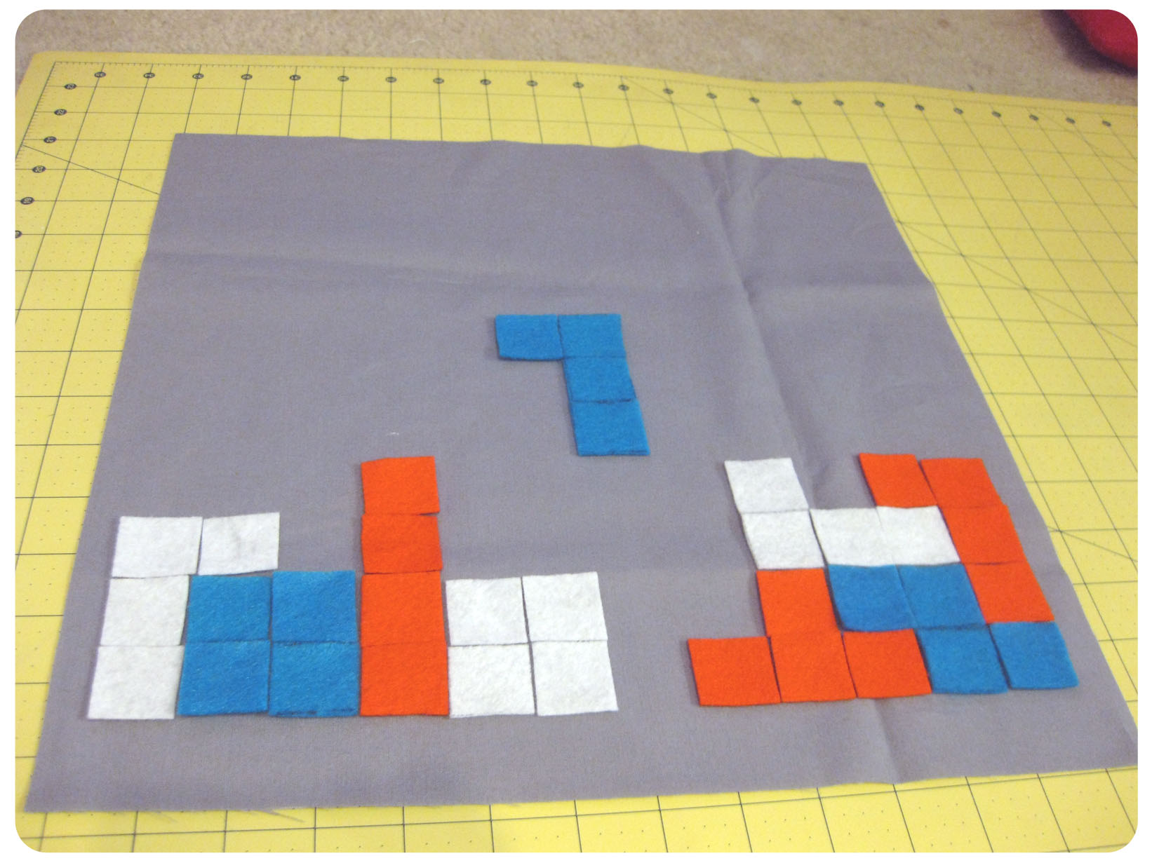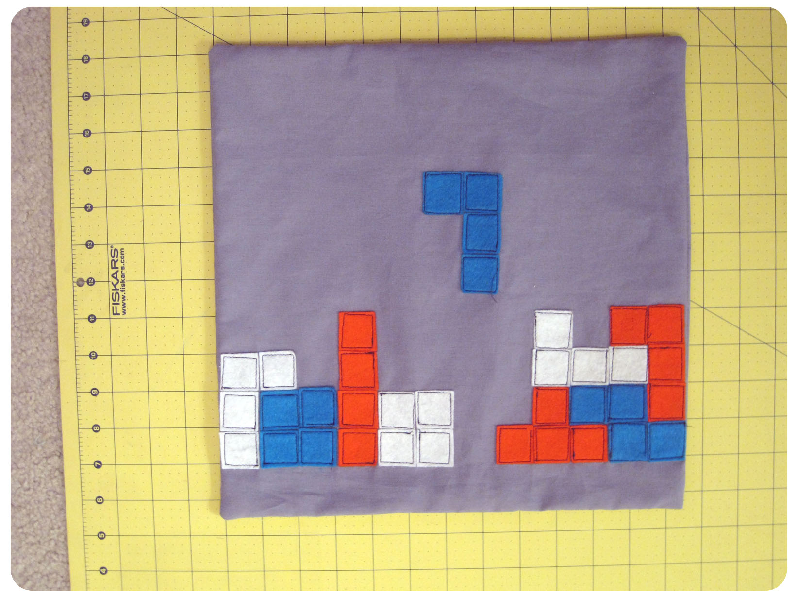 I found that I only needed about two columns worth of squares (four for two pillows). After all the squares were cut out, I played around with the placement of the Tetris pieces.