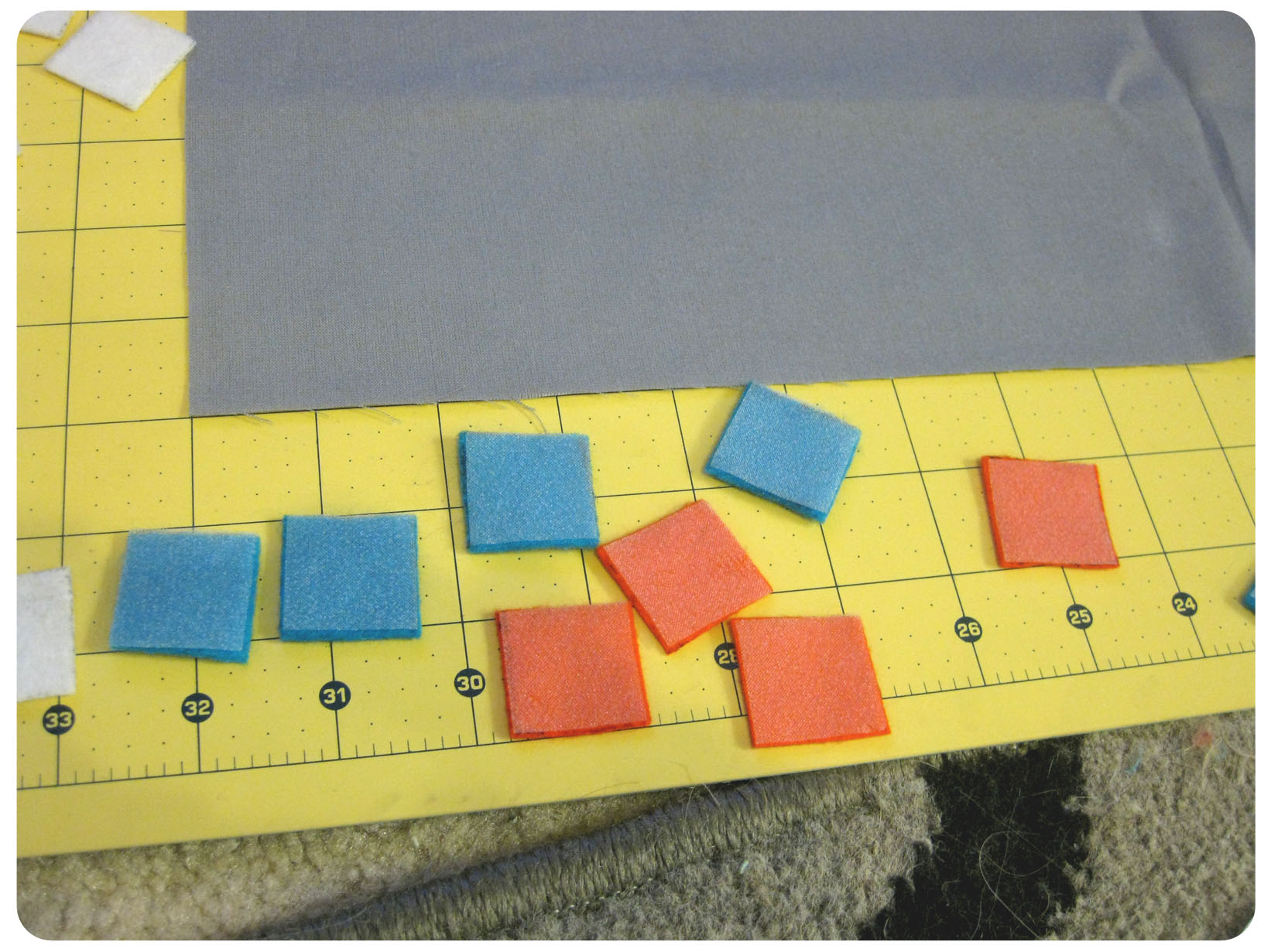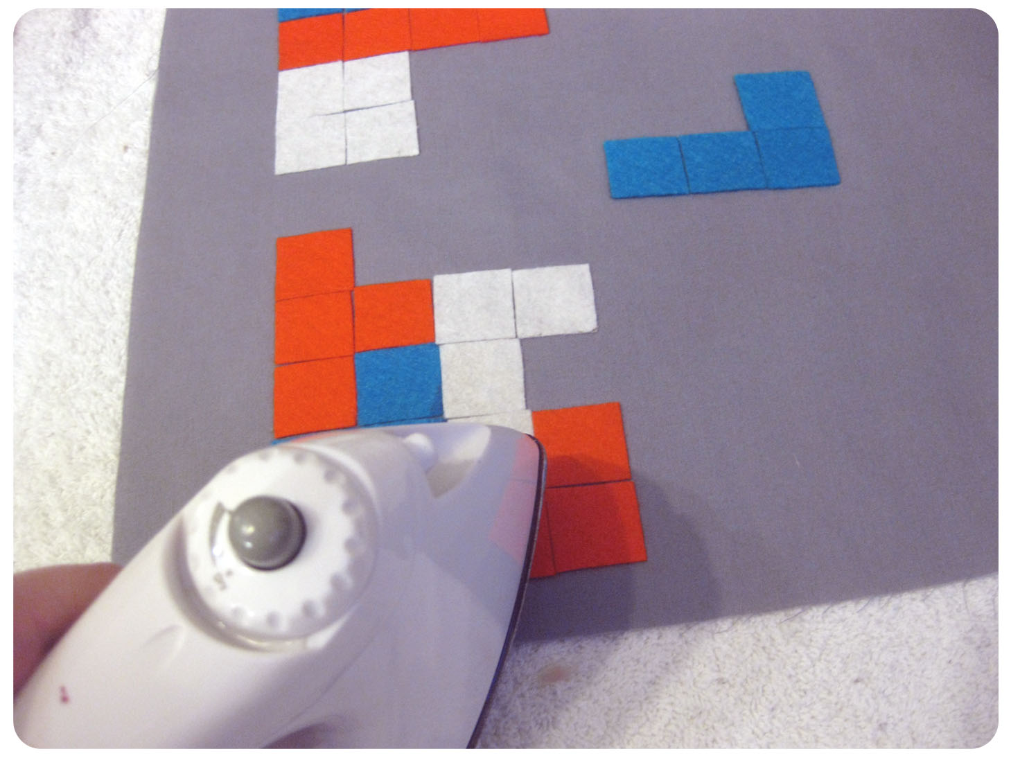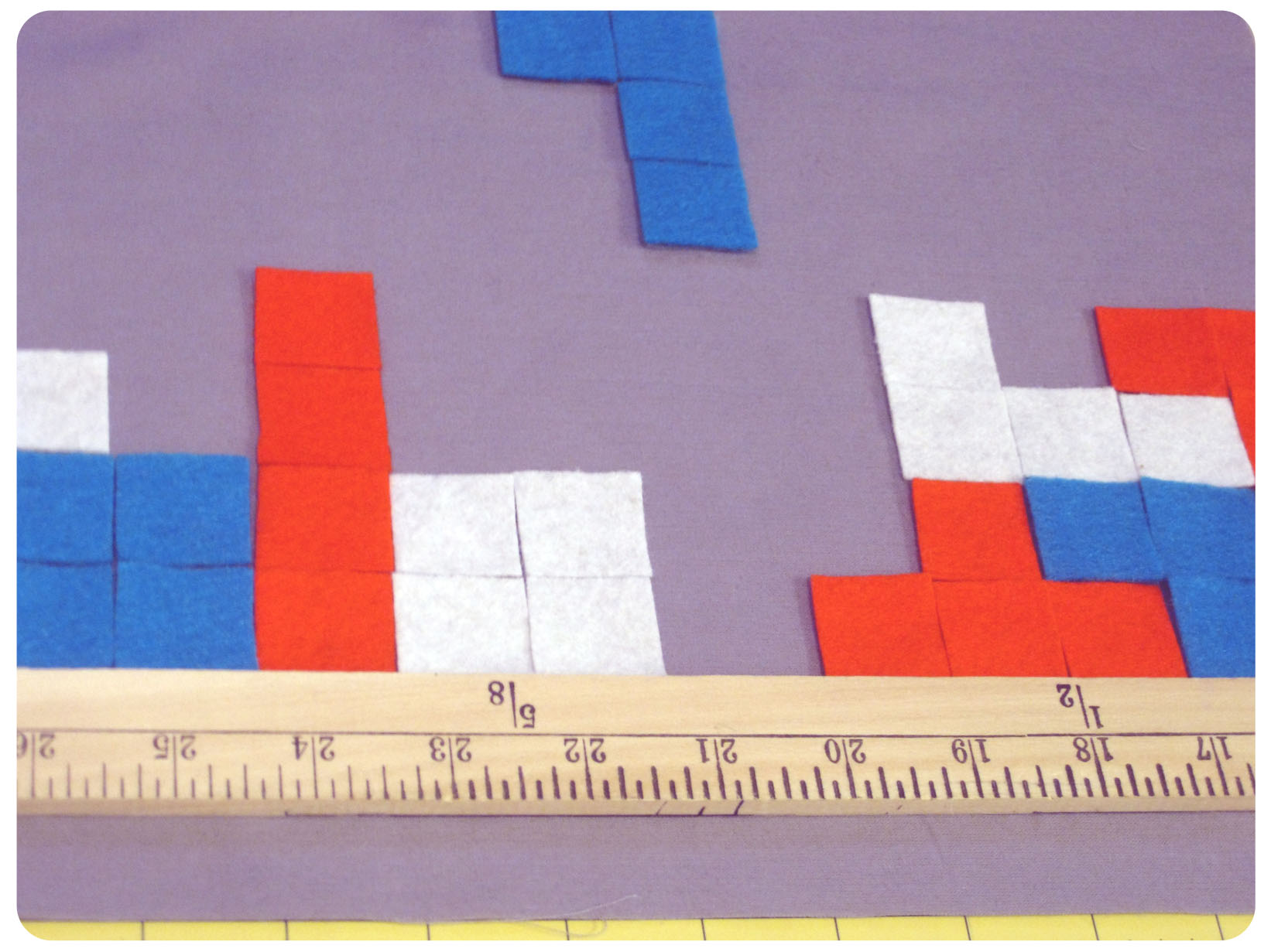 I created a similar gird pattern on the Steam-a-Seam as I did for the Tetris squares. After they were cut out, I peeled off the paper one side and stuck it to the back of the felt. I then peeled off the other paper piece.