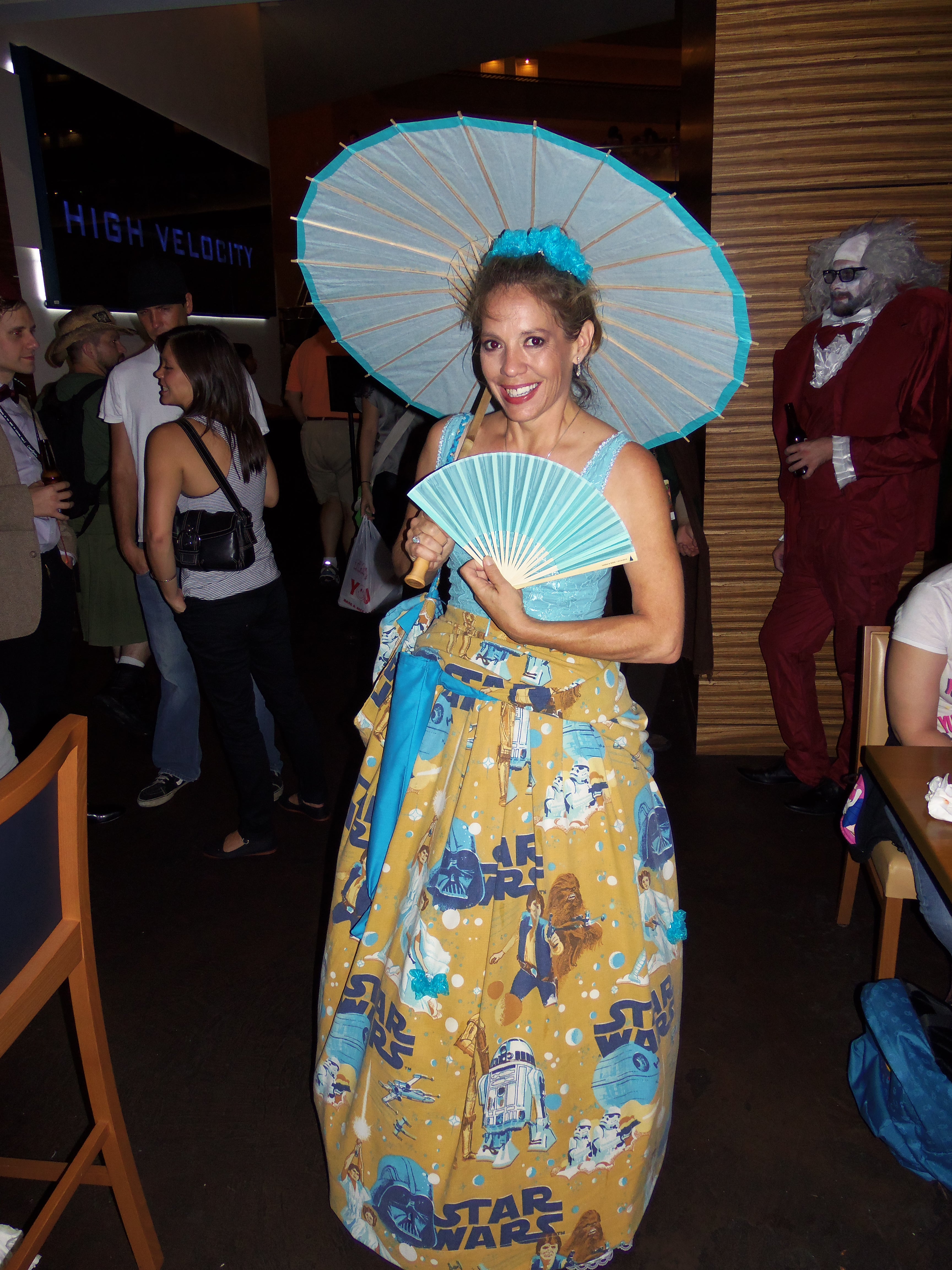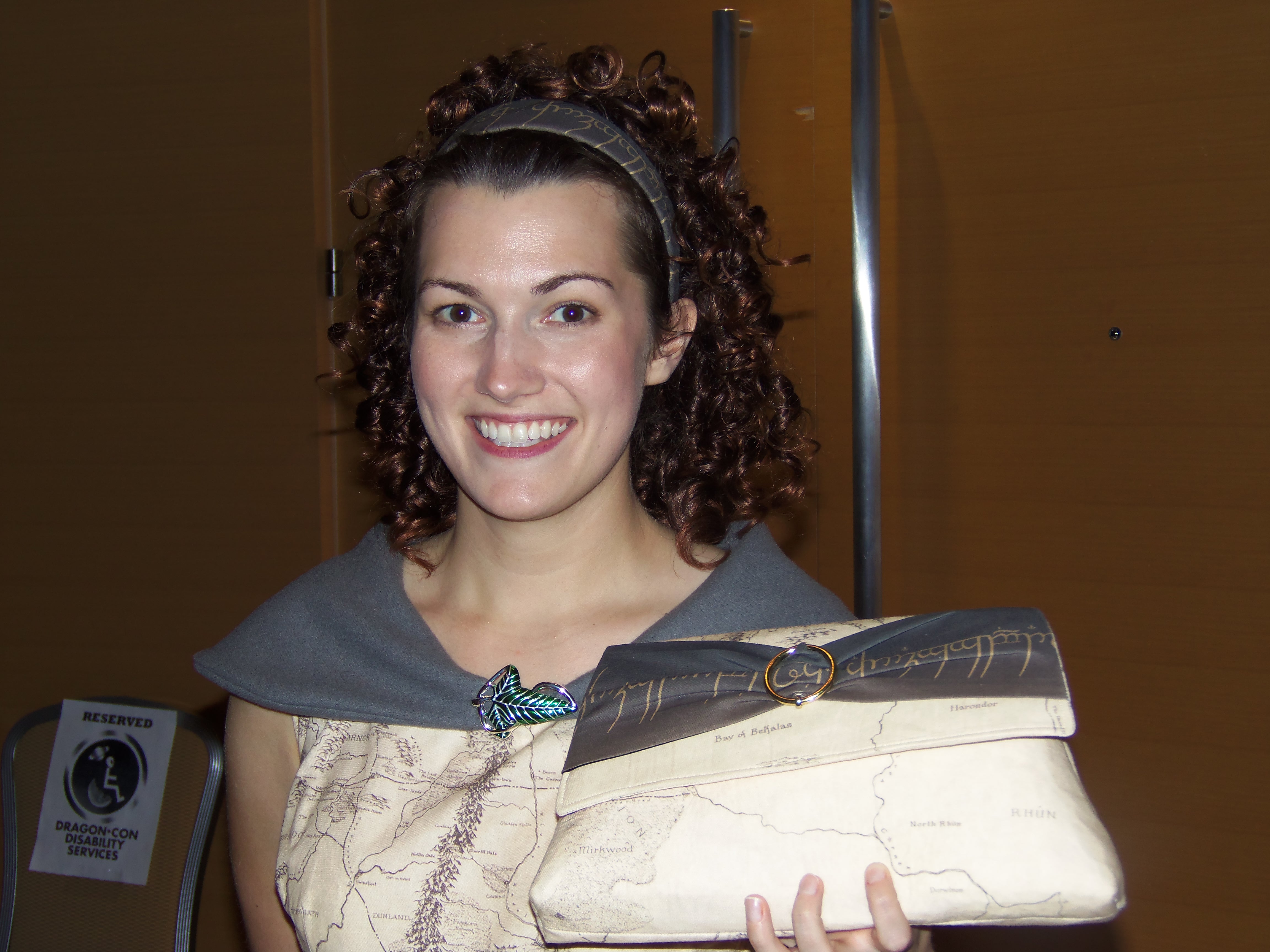 I really have to give a special nod to this ensemble, made and worn by Cressie Teague. I saw a glimpse of this outfit amongst the massive Dragon*con crowds, and literally ran over everyone in my path to make sure I got a picture of it. Her dress is a custom fabric print of the map of Middle Earth, the grey fabric collar is a nod to the Elven cloaks which highlights the Elven brooch beautifully, and the veritable cherry on top is, of course, the One Ring inscription as the trim of her dress, headband, belt, and oh, what’s that? A matching purse? To quote Rachel Zoe, not only is that bananas, but, I DIE.