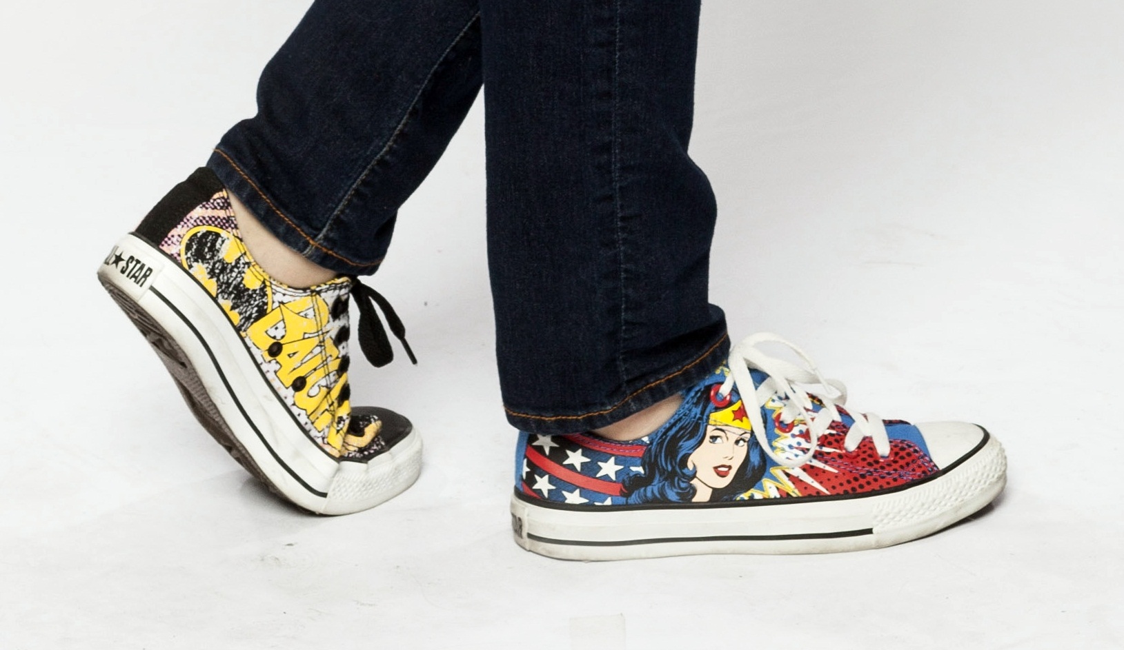 - These shoes are made by Converse Journeys. What I love about the Journey DC Comics shoe line over the shoes by Reebok and Adidas is the fact that they actually list these shoes in sizes for Men AND Women. Plus, instead of being a shoe design inspired by an outfit or character, they’re mini-comic book works of art! I loved the designs so much that I couldn’t pick just one and bought both the Batgirl and Wonder Woman pairs, and wear one of each.