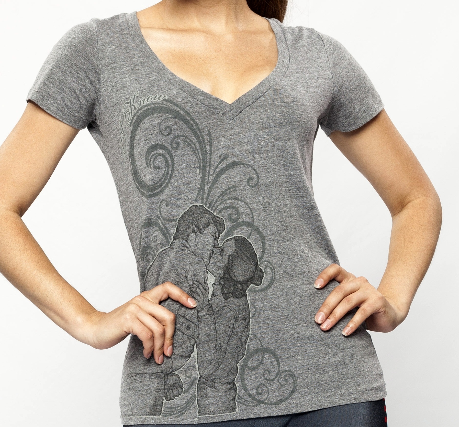 - This Han and Leia shirt was available from Her Universe and was an instant buy for me. The subtly and beauty of the artwork makes it incredibly appealing, as well as the fact that it’s known as the “I know” shirt since it depicts that infamous and unique exchange of love between Han and Leia before he’s frozen in carbonite. This shirt is, unfortunately, no longer carried at Her Universe, but at this point in time they have come out with a lot of great new designs and styles, and I’m looking forward to whatever new products are yet to come. Her Universe is a definite must for the geek wardrobe, and is a great foundation to building a stylish ensemble.