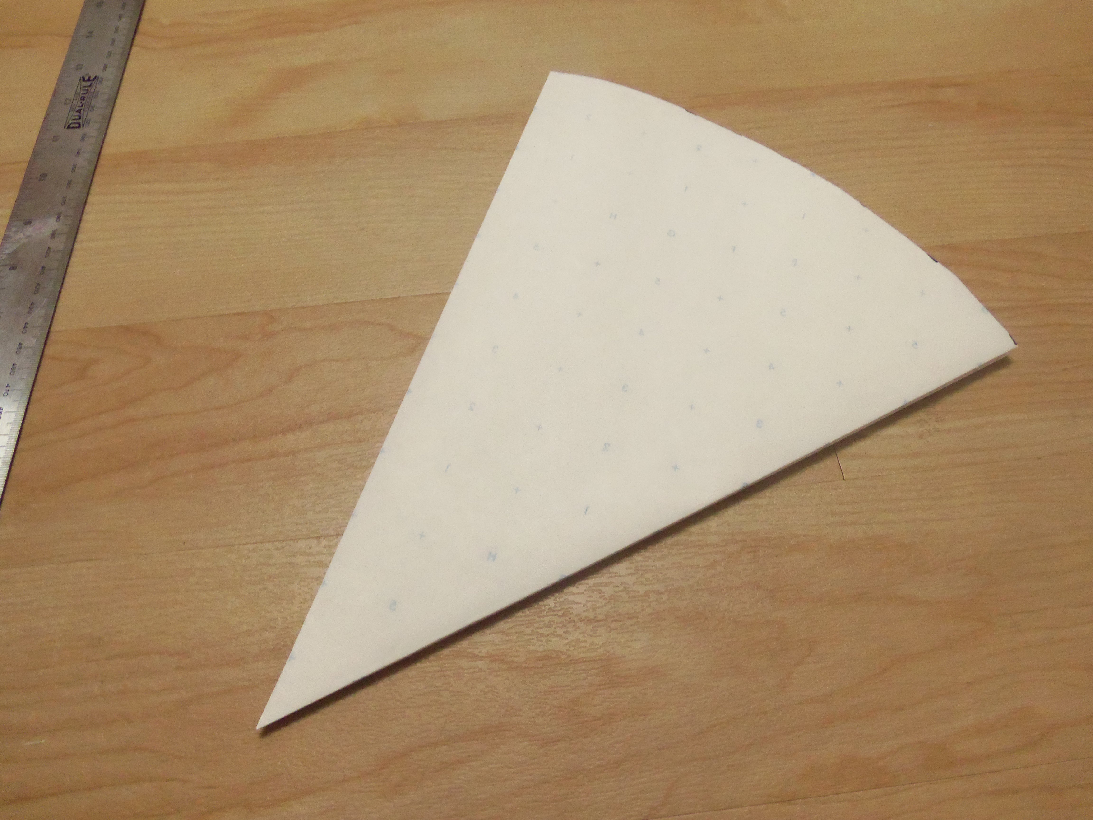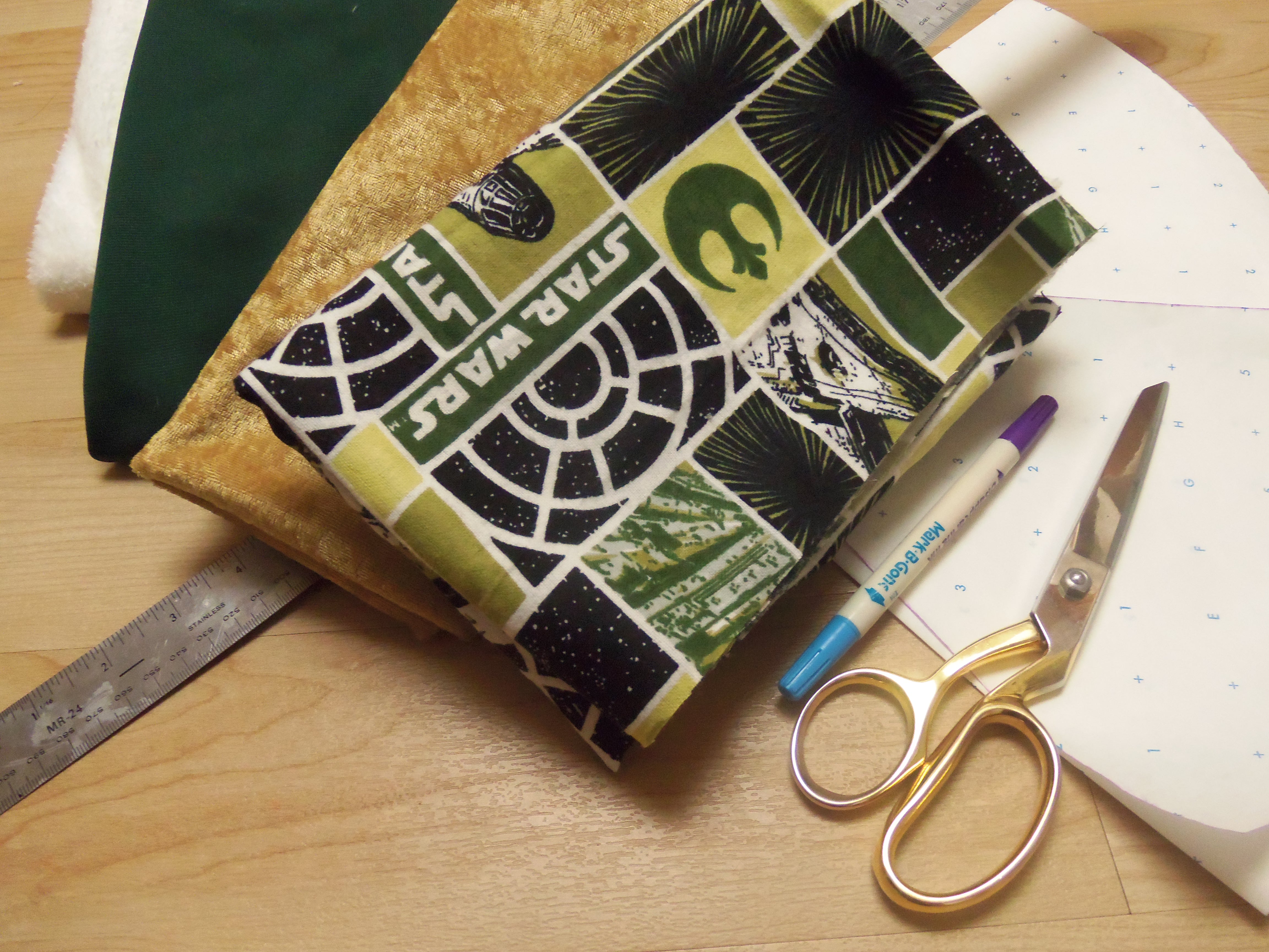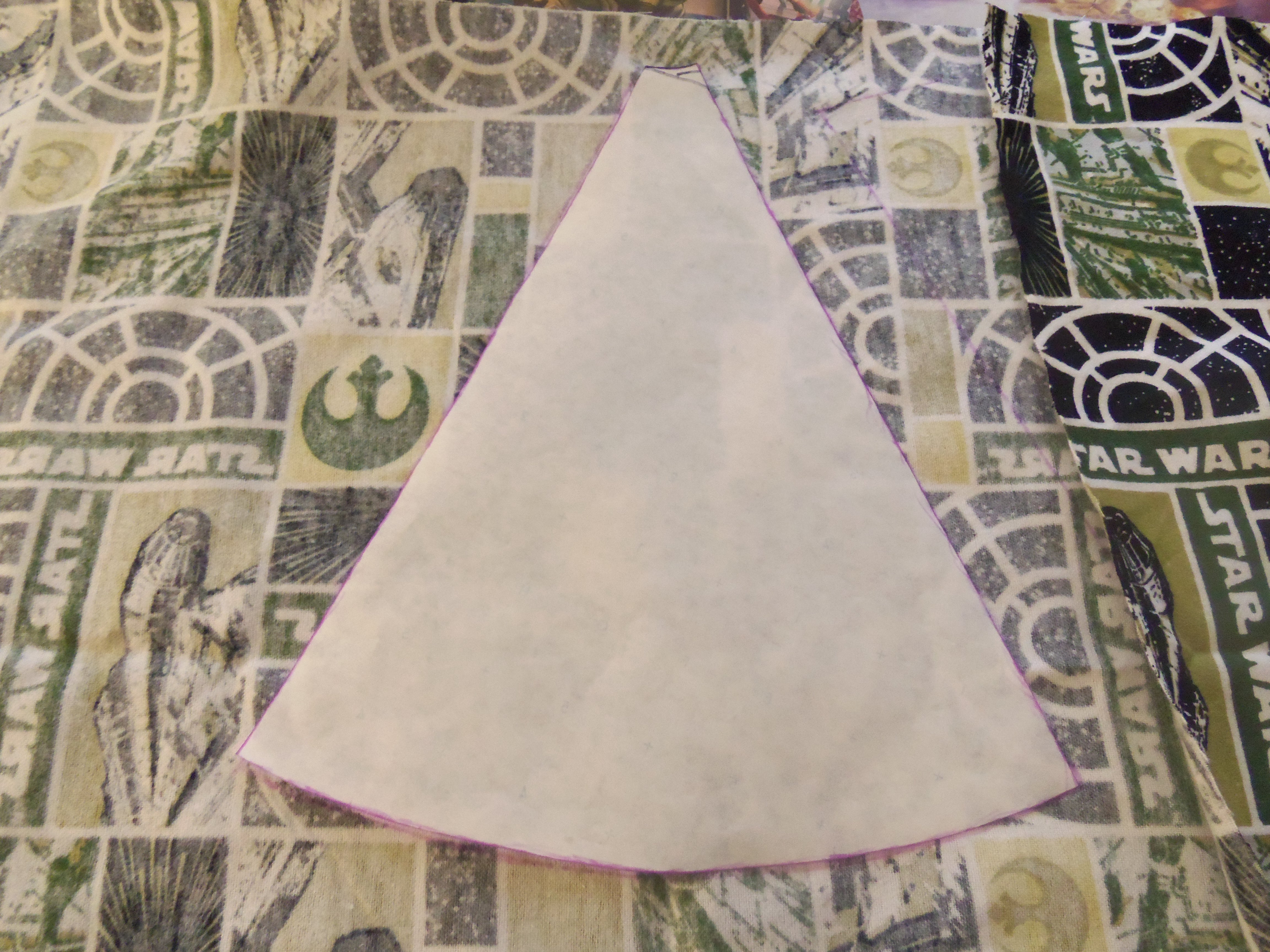 I cut out one pie shape from the circle pattern I’d made. This would be my pattern template to cut out my alternating gold and Star Wars fabric pieces.