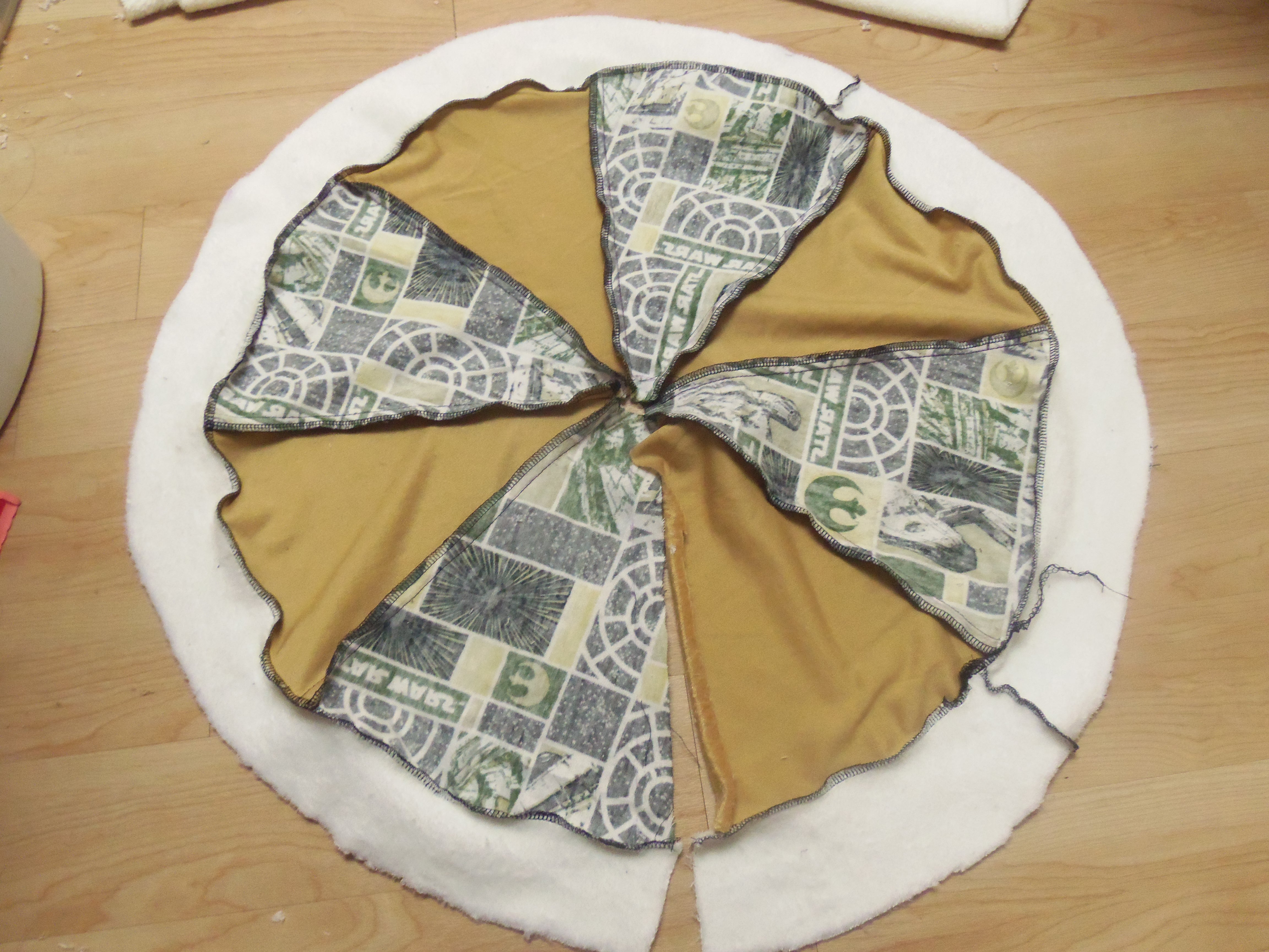 Once I had my 4 gold pieces and 4 Star Wars pieces cut out, I stitched them together. Make sure you don’t stitch your circle pieces completely together. You need to leave it open so that it can wrap around the tree trunk.