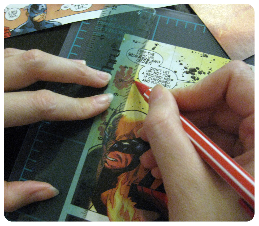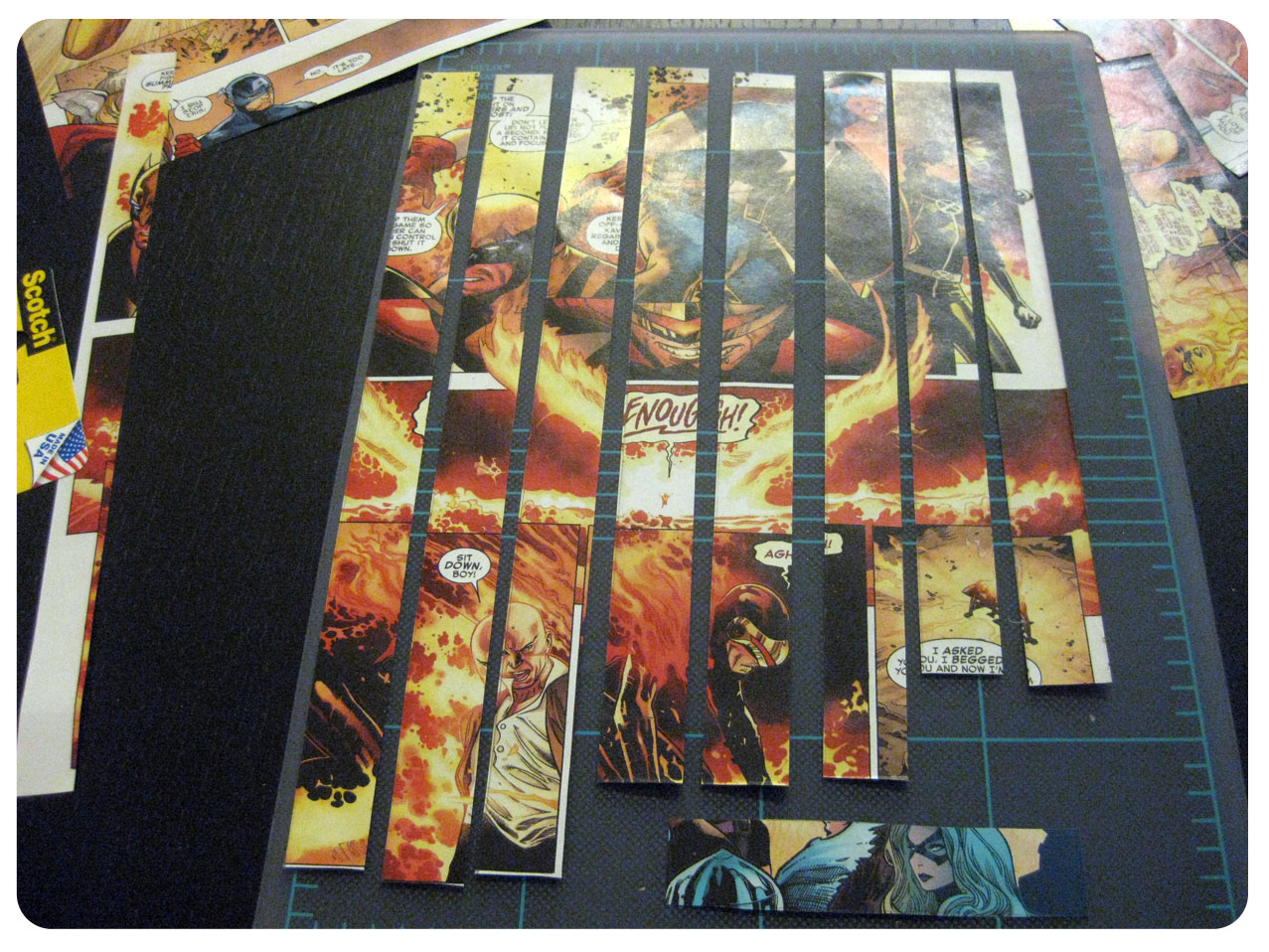 Because comic pages are only a little over 10 inches tall, I adjusted my strips accordingly. I cut three 10 inch strips, three 9 inch strips, two 8 inch strips, and one 3.5 inch strip for the center.