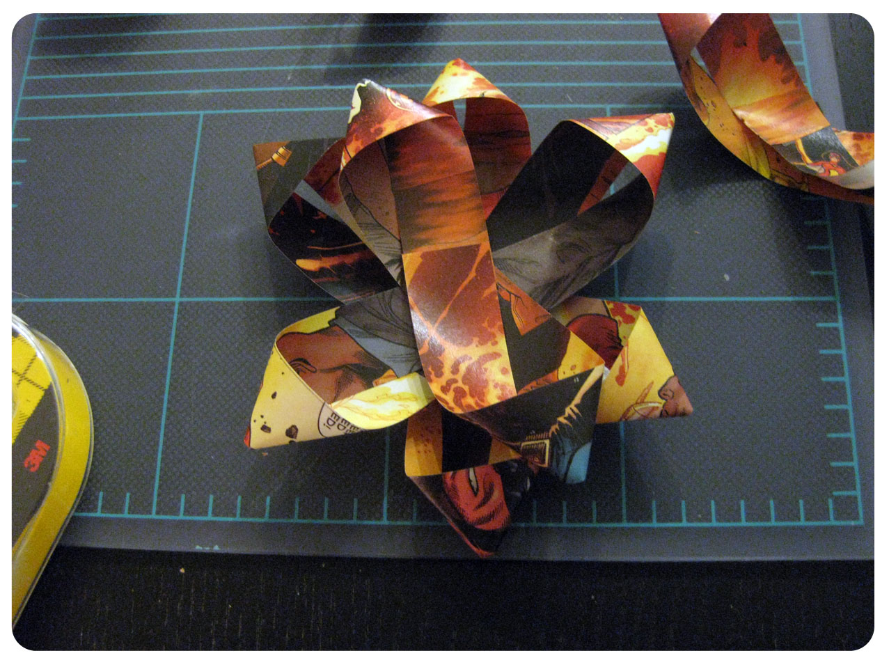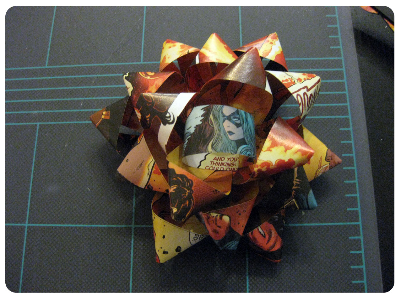 And that’s it! I wrapped my gift in plain brown paper so that the bow would stand out better. What’s great is it didn’t take very long, and I still have plenty of comic pages I could use to make more bows. You can even make different sized ones by adjusting your strip lengths.