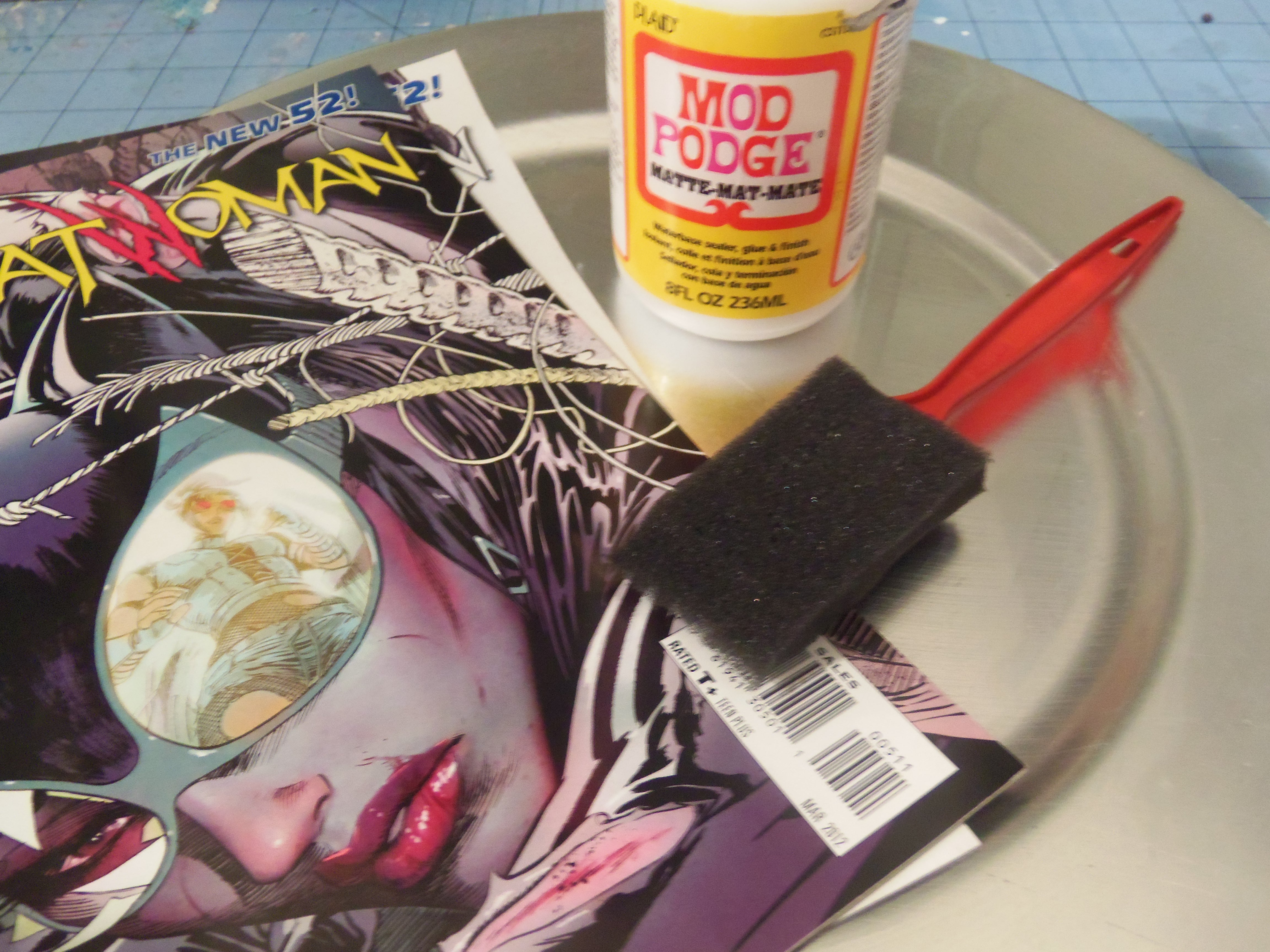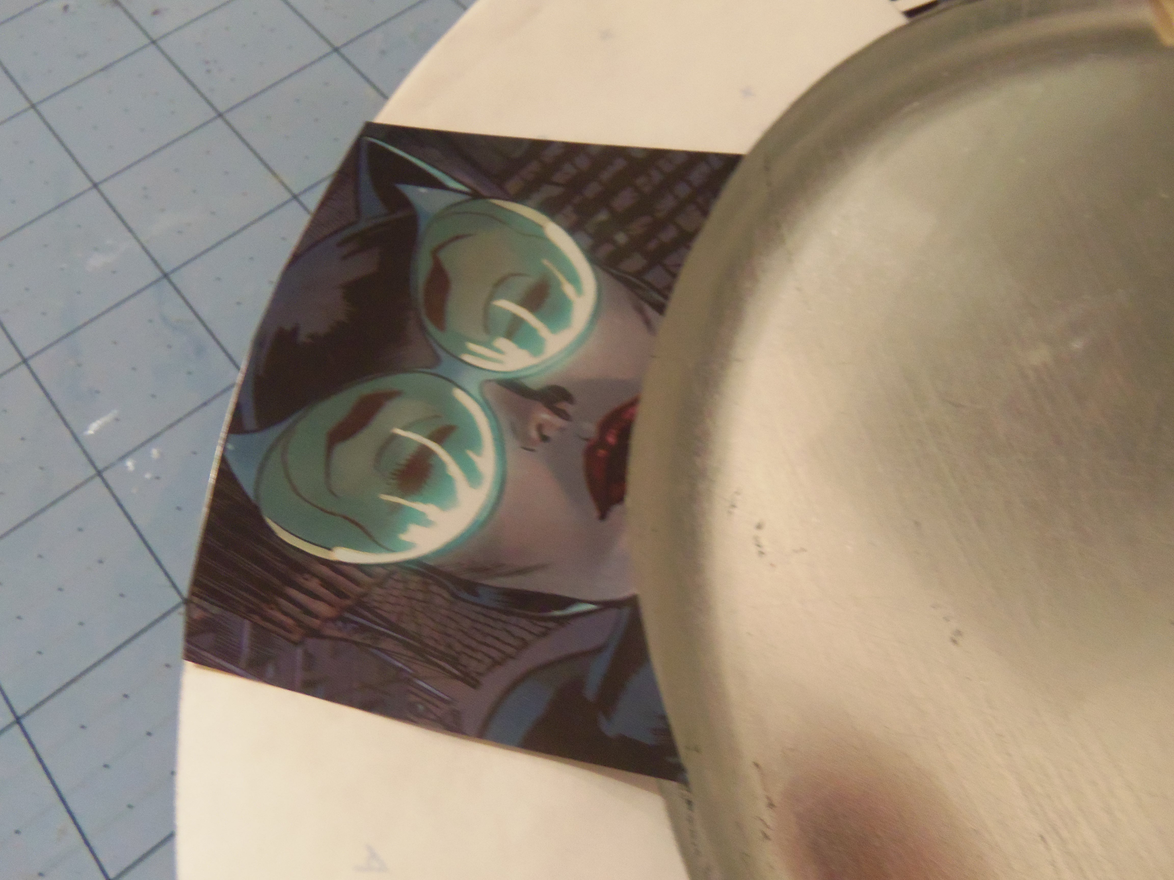 I used some Catwoman comics I had leftover from a previous project, and luckily there were enough images left over so that I had various depictions of her face to use for the rim. With the rim pattern, I could have cut out each piece so that they would all connect perfectly to one another around the rim…but I didn’t. Oops.