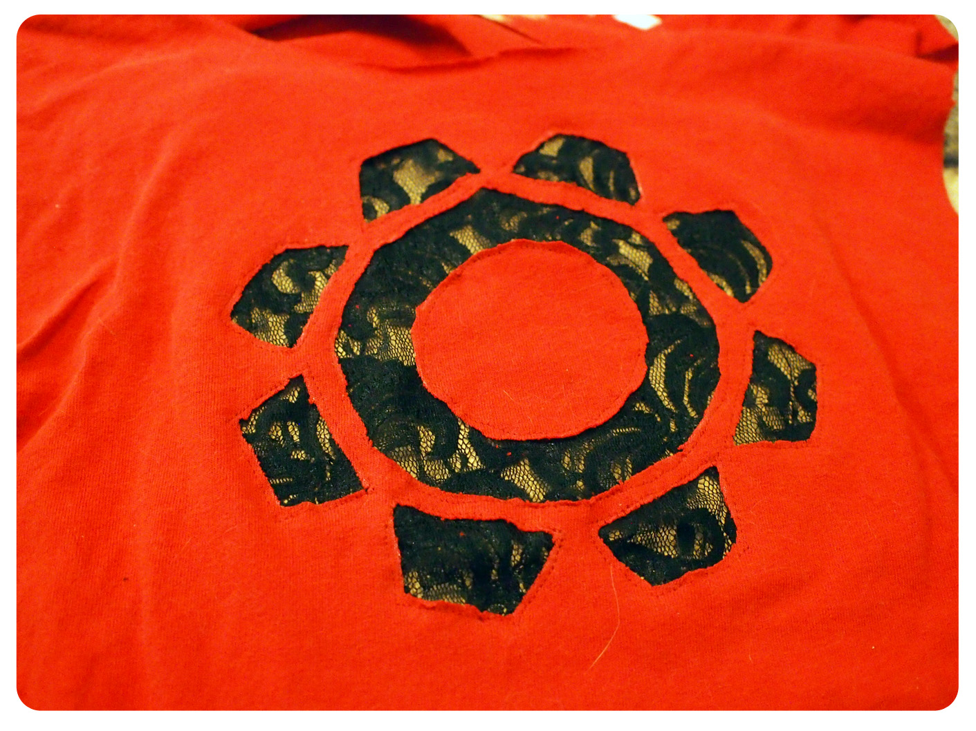 Next, I cut out the design and pinned the lace to the shirt. I then sewed around all the holes so the lace would stay put.