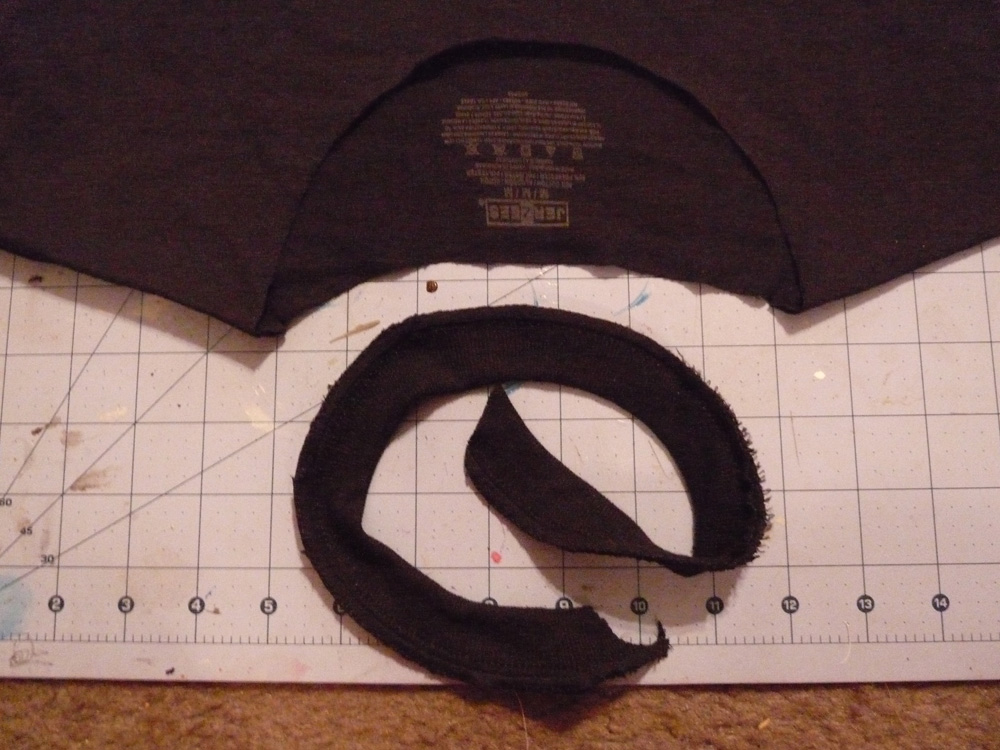 Nightwing DIY Step 1The DIY on Pinterest started with cutting off the collar, which is entirely optional, but I followed suit as I liked the look of the shirt being oversized and loose, and being able to go off-shoulder.