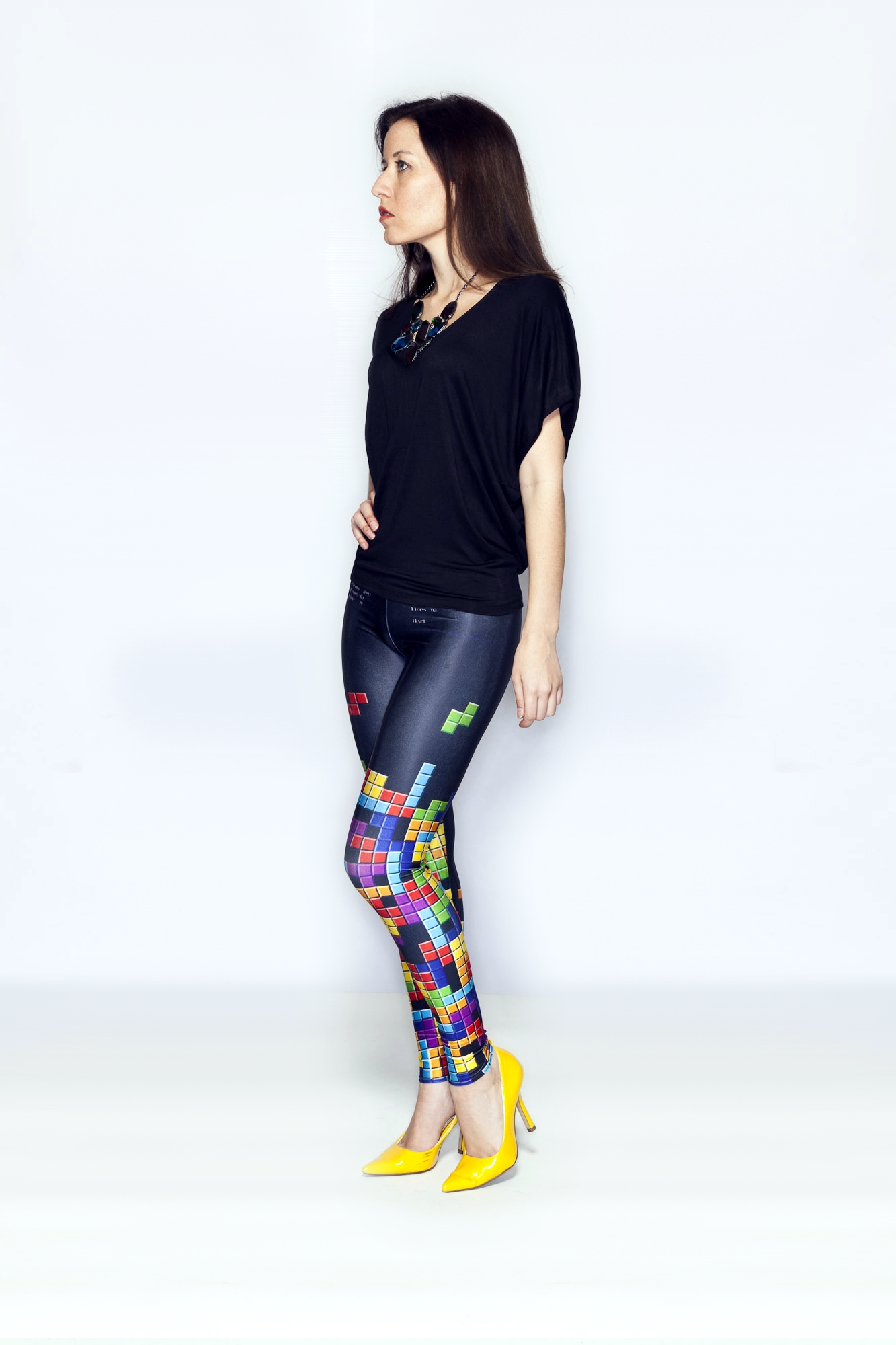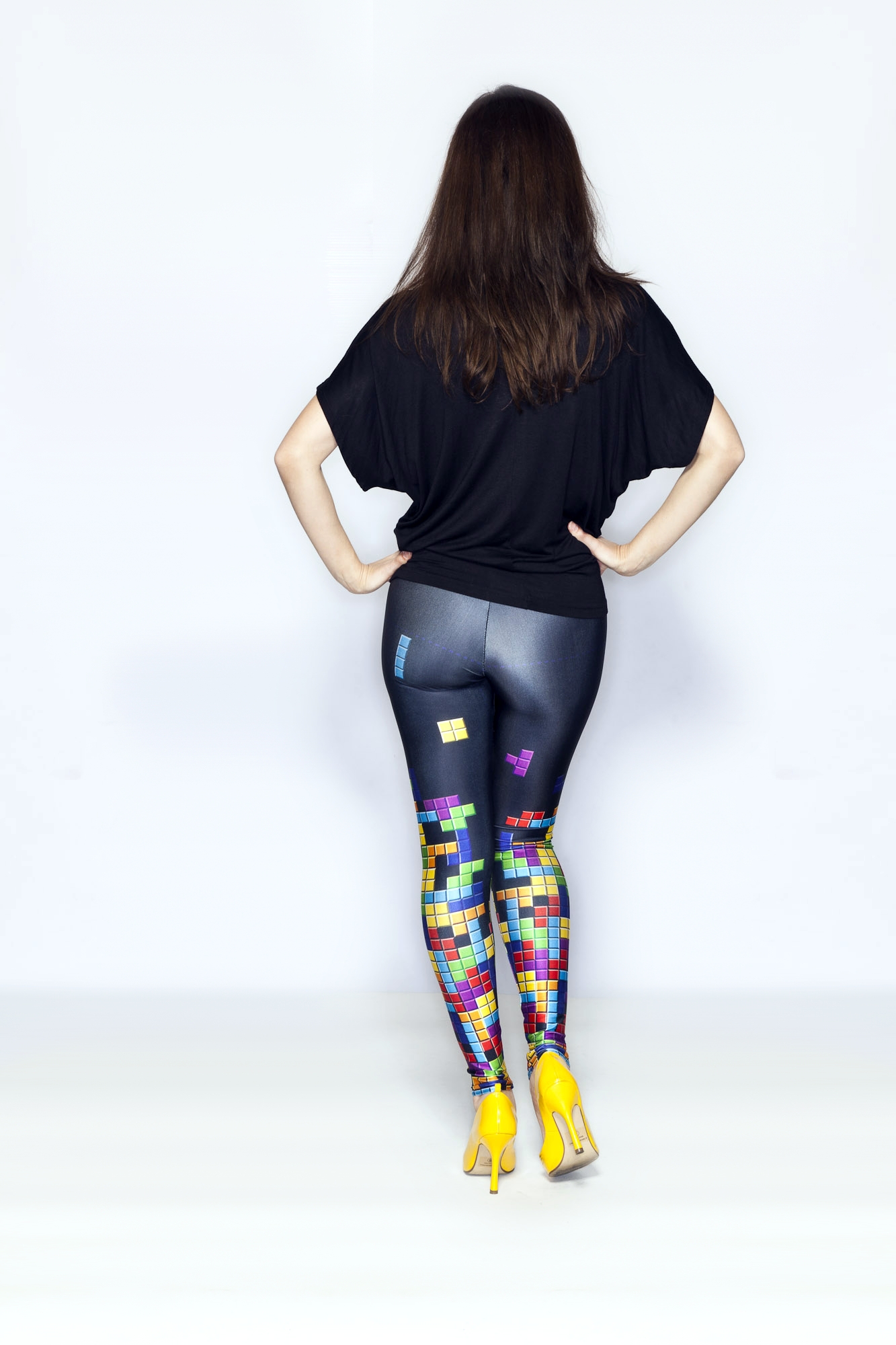 - I already had these shoes in my closet, from an old cosplay no less! If I don’t wear black shoes with my outfits, I always love to wear a pair of shoes that shares a color that is in the outfit. The bold bright yellow of these heels pairs perfectly with the yellow Tetris block color in the leggings.