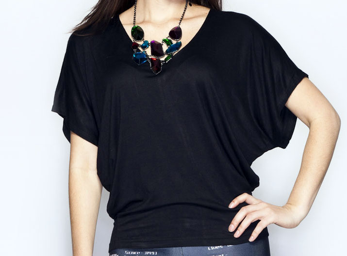 - I can’t remember where I bought this necklace, but I purchased it because I deemed it to have a Star Trek vibe to it. The colors matched nicely with the Tetris block colors, and is a great way to fancy up the look. If you’re wearing a heavy/detailed necklace, it’s always good to go simple with the top.