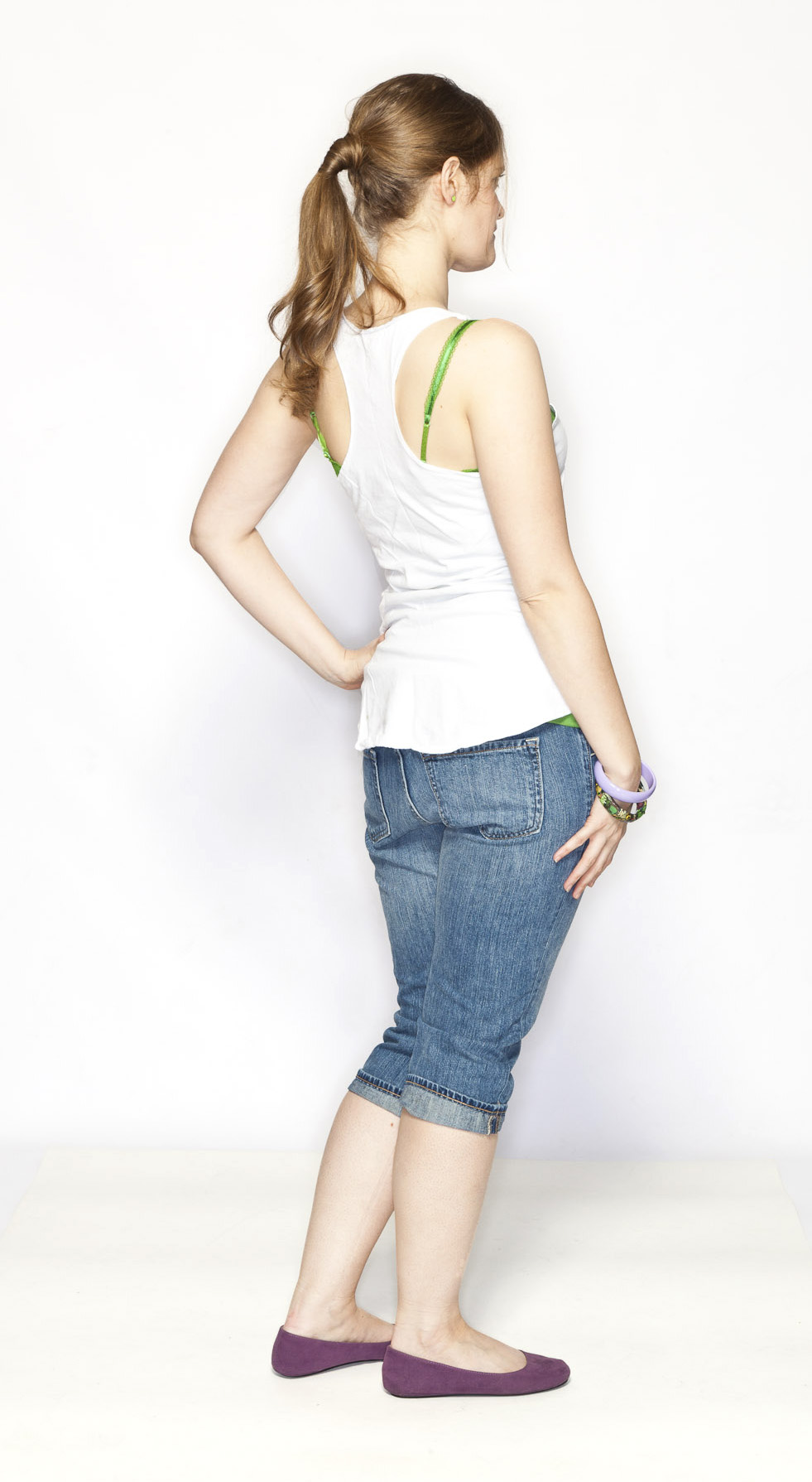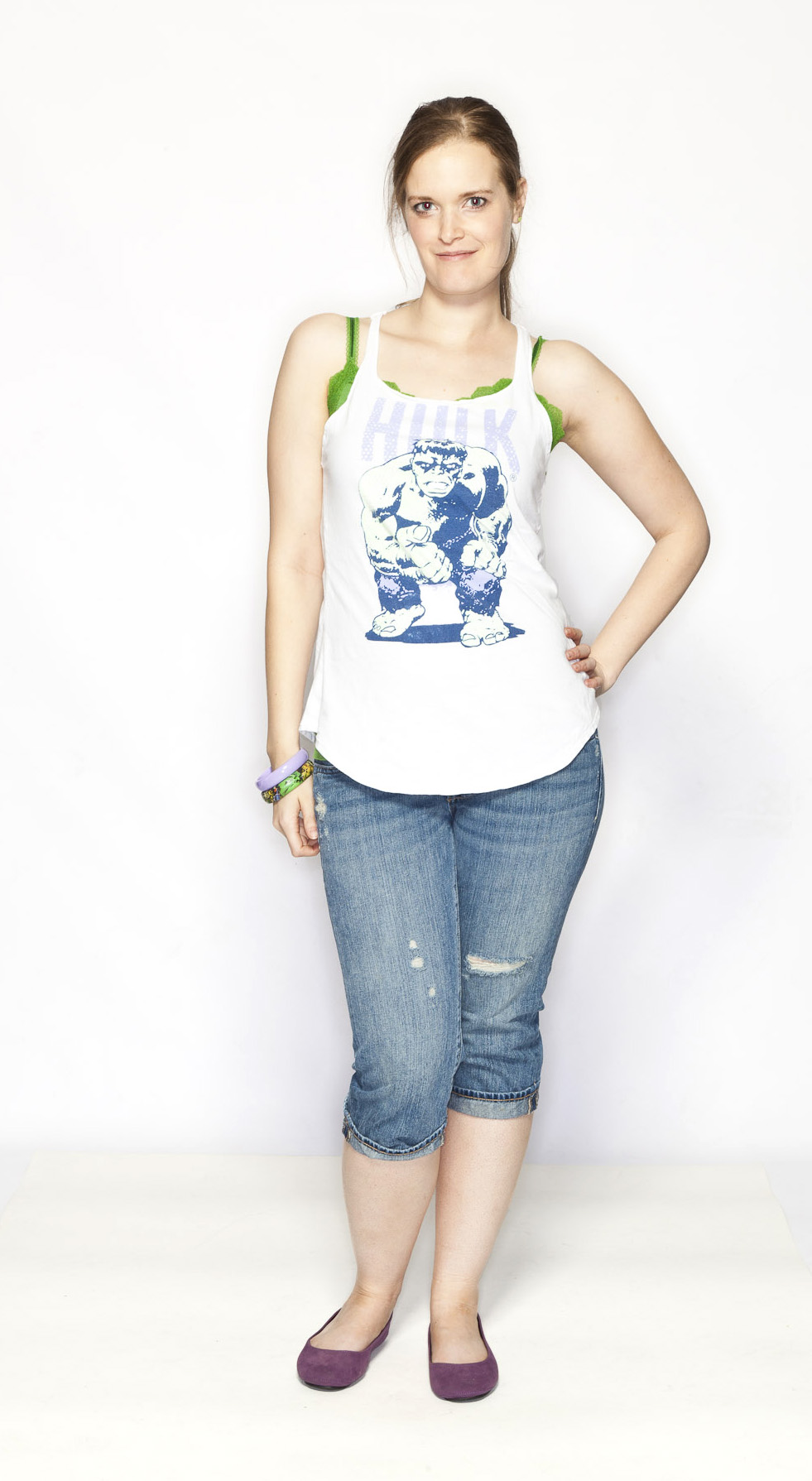 - Since I was putting together a Hulk outfit, I wanted to tie in ripped clothes in somehow. Luckily, distressed jeans is in right now, so I wasn’t difficult to figure out how I would incorporate it. I actually had my capris on hand, but I picked them up from Old Navy. If a capri style isn’t your thing, they also have distressed versions in shorts or pants.