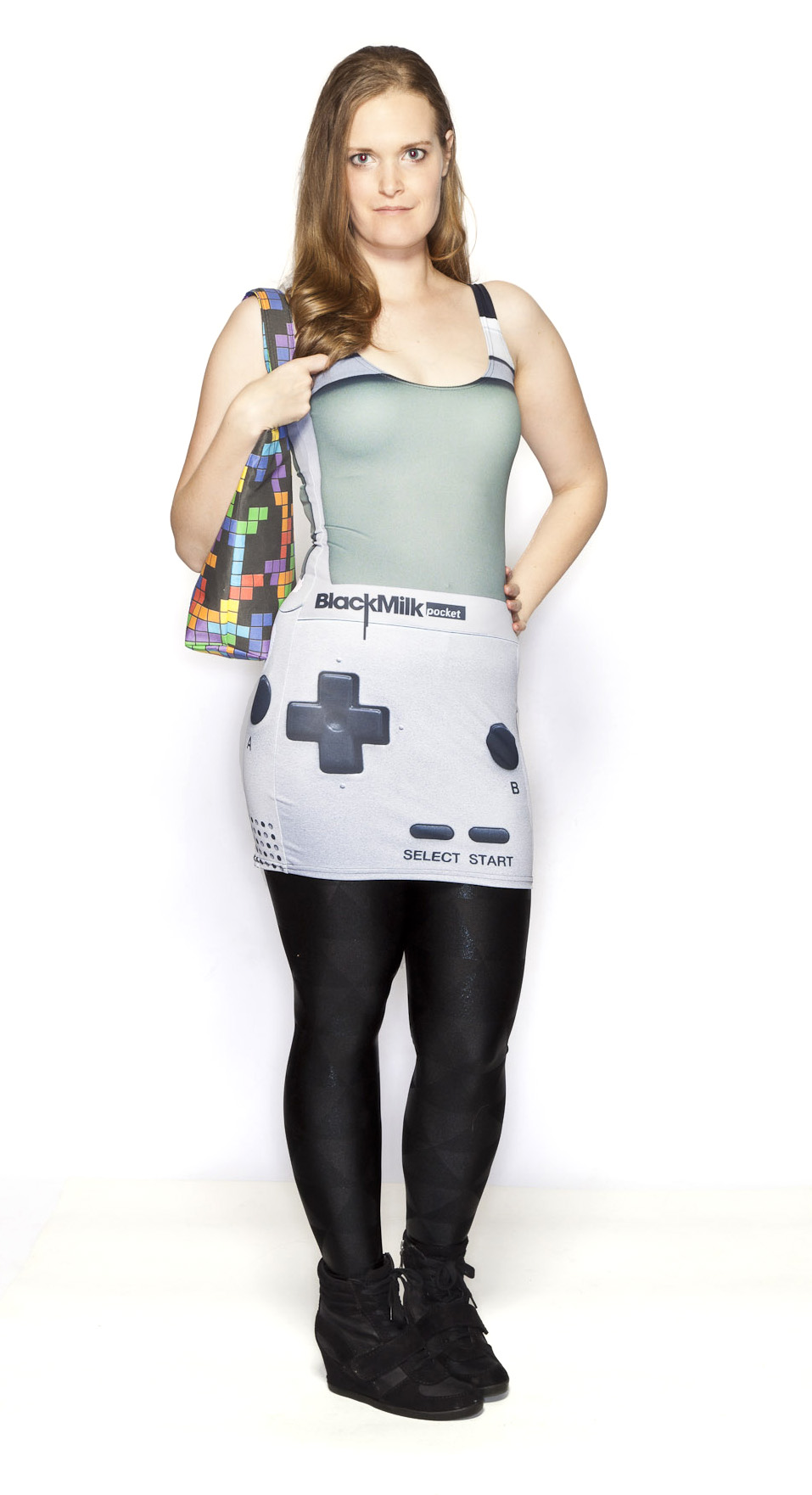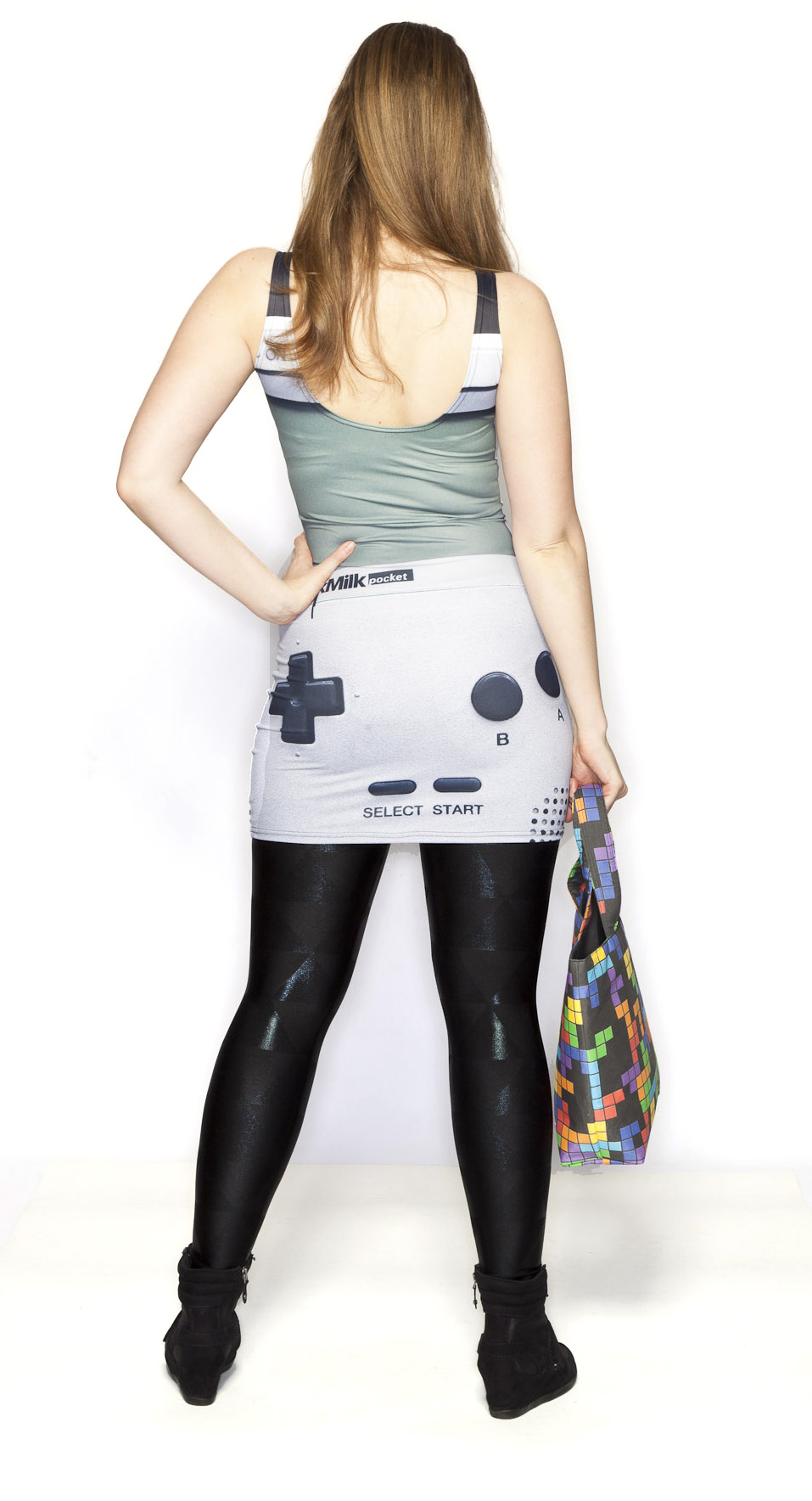 - The bag is by far my favorite part of the outfit. Since I did play Tetris the most on my Game Boy, I knew it would be a perfect compliment to the outfit. This was the bag I got to take home after the photoshoot I did with The Bag Depot. This bag in particular was made with custom printed fabric, and is so well constructed. I’ll definitely be bringing it around with me as I scour the con floor for geeky items.