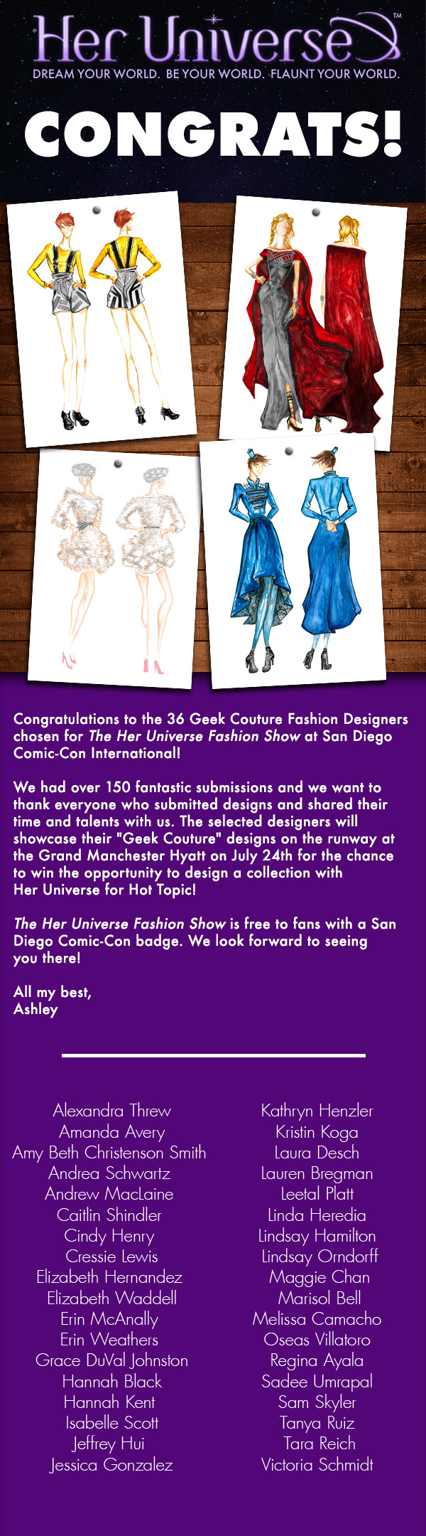 2Her Universe made their official announcement today, releasing the names of the finalists for the Her Universe Fashion Show Contest, whose designs will walk the runway this July and San Diego Comic Con.