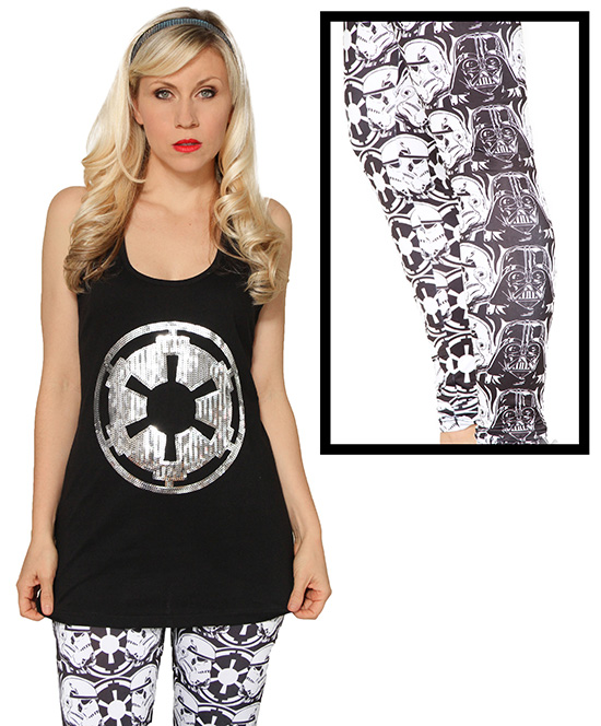 Already a huge fan of the Rebel and Imperial logo tanks Her Universe released awhile back, these new sequined pieces are wonderfully stylish and sure to turn heads. As will the new black and white leggings featuring a sharp, fashion forward design of the Imperial Cog, Stormtroopers, and Darth Vader.