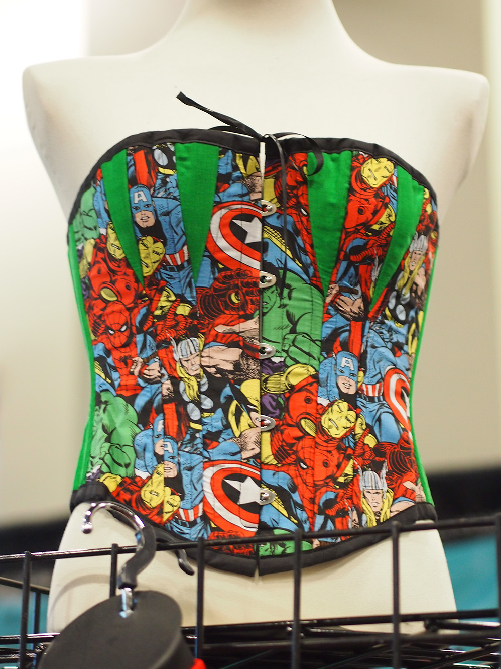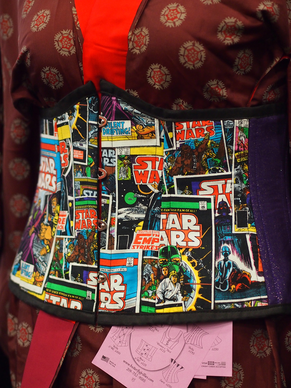 Butterfly Frillies featured a really nice selection of corsets and underbust corsets with geeky fabrics accented with some fun glittery fabrics.