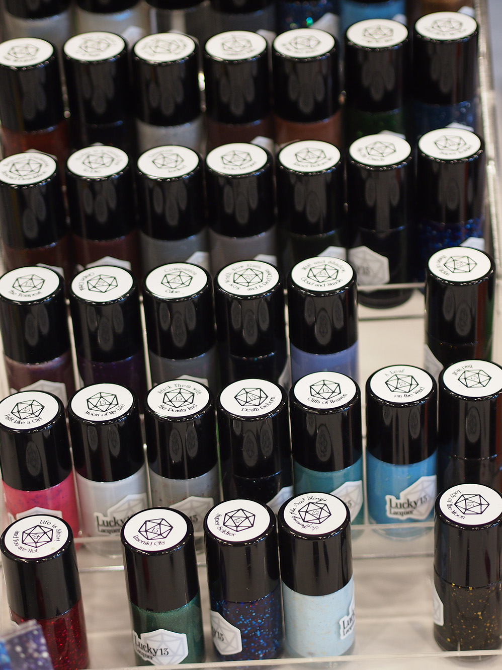 Lucky 13 Lacquer had a fantastic selection of geek influenced nail polishes. In addition to glitter polishes, they also had polishes that glowed in the dark and change with temperature.