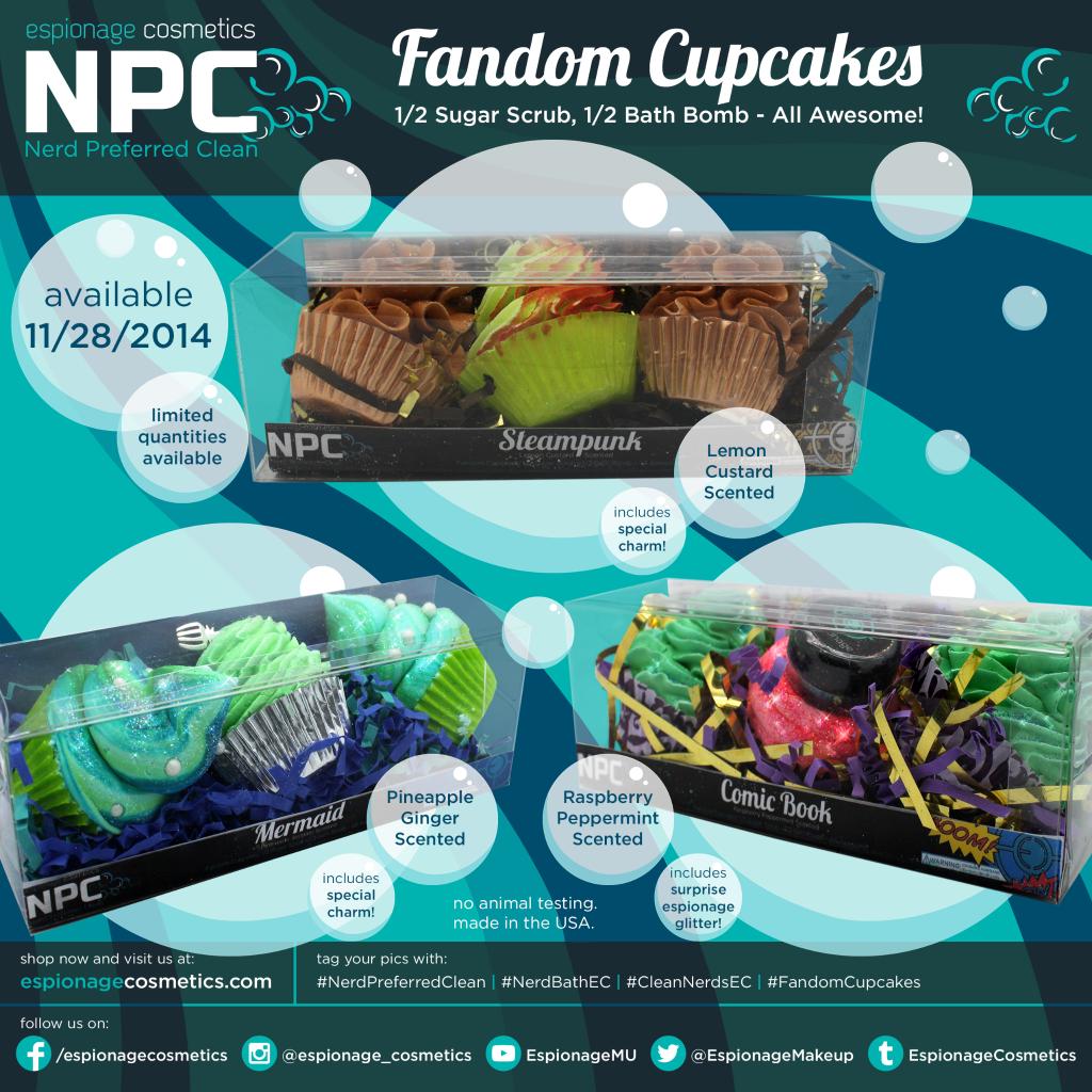 Something a little different, Espionage Cosmetics will be debuting these bath bomb/sugar scrub fandom cupcakes. You can pick up a trio for $15, but quantities are limited. If you miss out on the cupcakes, they will also be running a 25% off sale from Friday – Sunday.