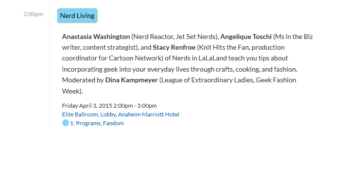 Lindz and I were on this panel last year, and I’ll be returning again, along with the incomparable Leetal Platt of Cozday Clothing. This will be a great staple panel to attend for anyone interested in geek fashion!