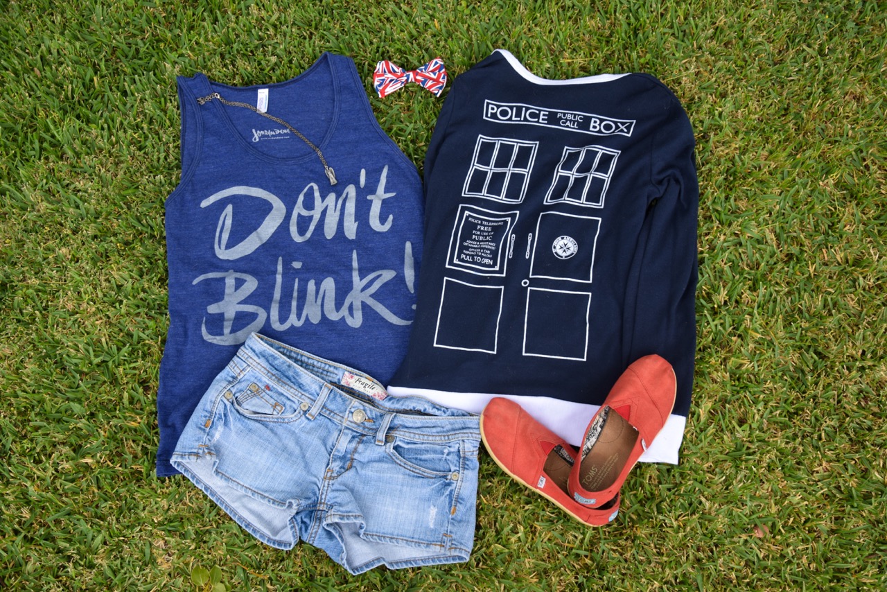 Her second day outfit is all Who. The cardigan is from Her Universe, Don’t Blink tank by Jordandene, Weeping Angel necklace and Union Jack bow from Hot Topic.