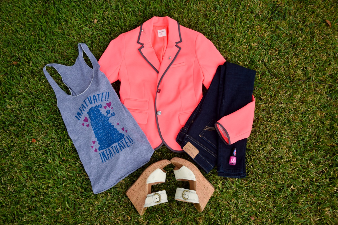 Her first night time outfit is more Doctor Who with a tank from Look Human, blazer from Gap, Jeans from Hollister, and shoes from Born.