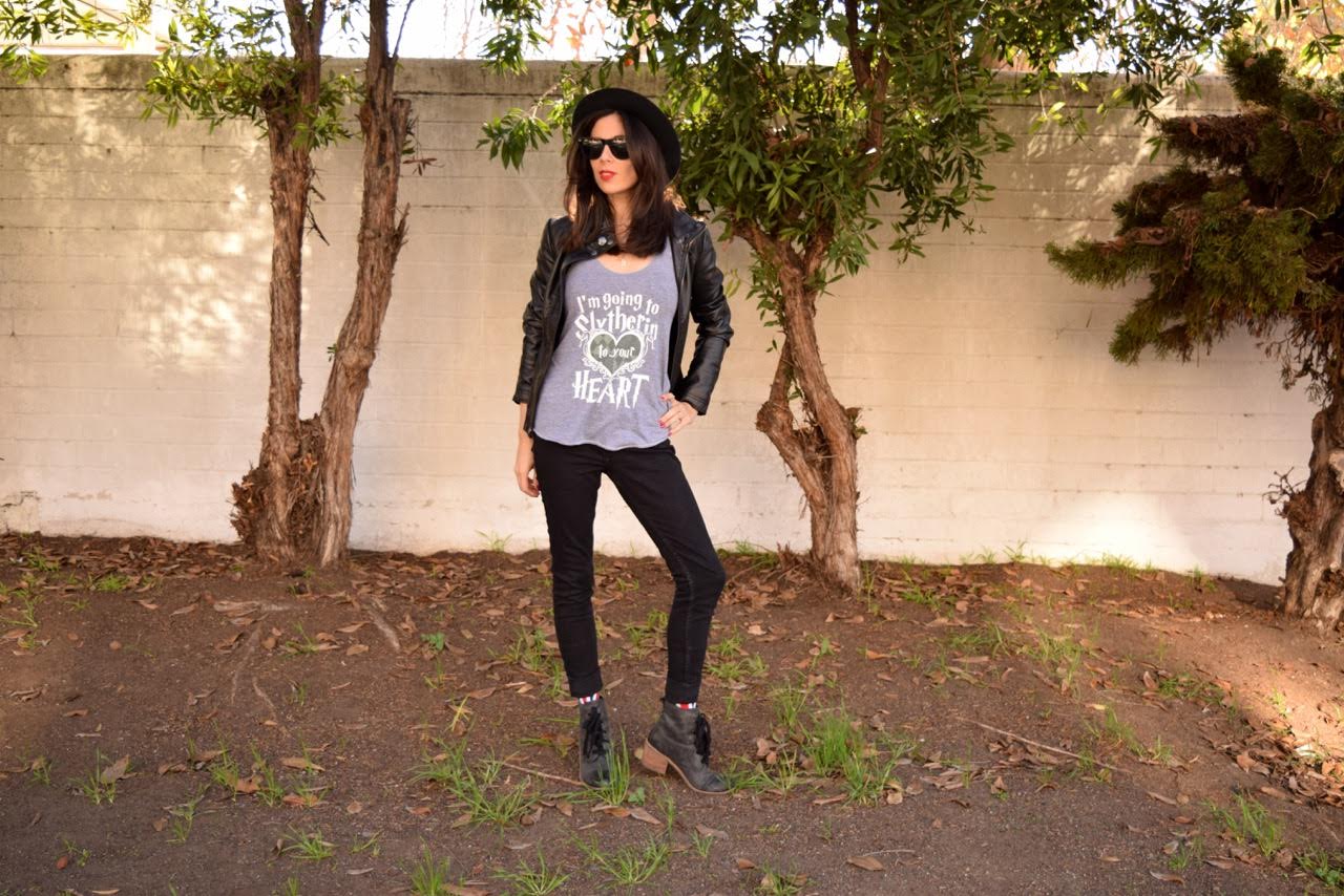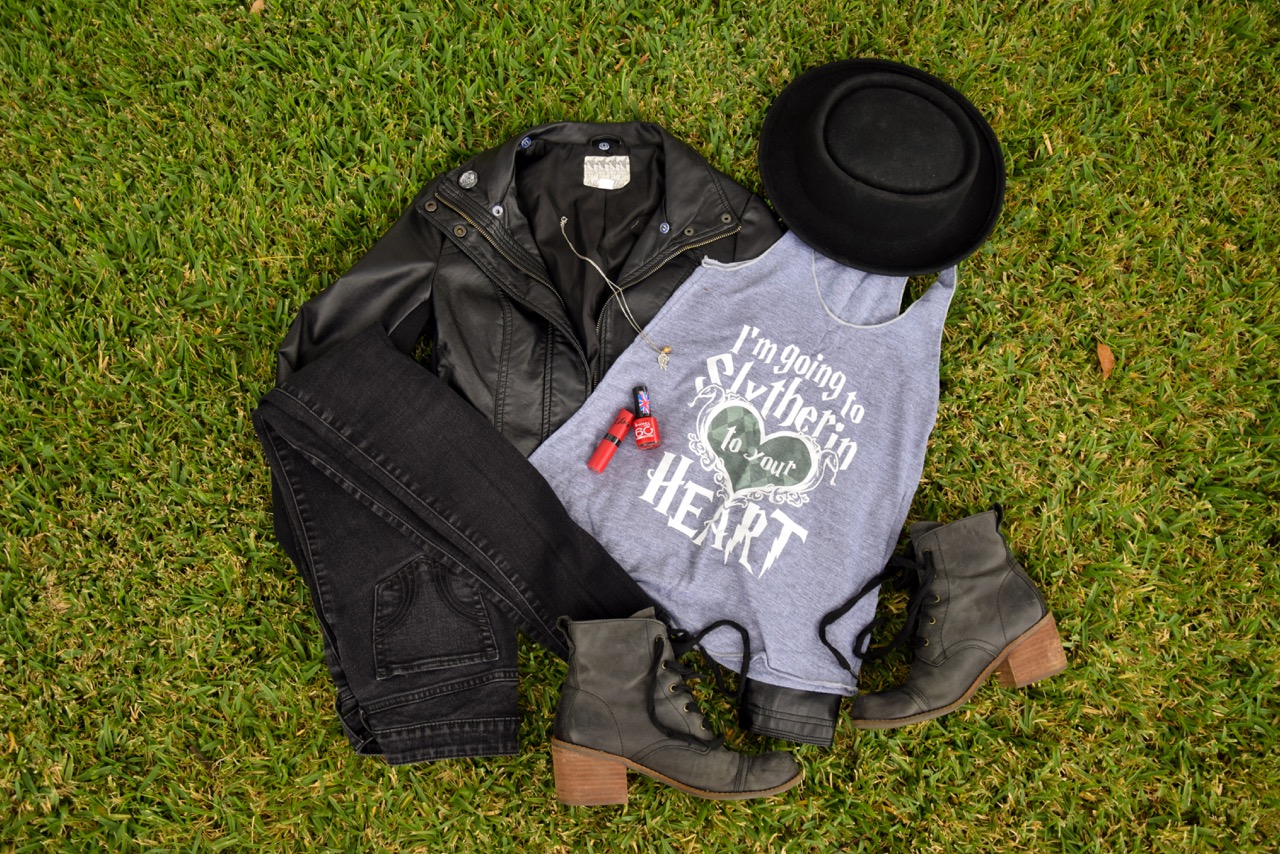 Lastly, her second night outfit puts the ‘S’ in Slytherin with another tank from Look Human. The jacket from Sun Diego, Jeans are from Hollister, hat from Forever 21, boots are Nordstrom, and the Golden Snitch necklace from Jordandene.
